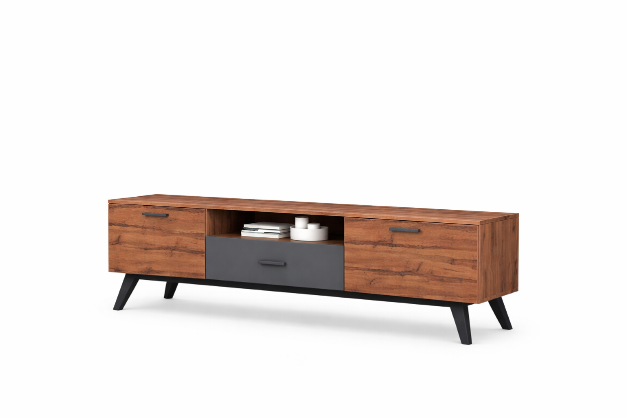 Έπιπλο τηλεόρασης με δυναμικό και λειτουργικό σχεδιασμό που προσφέρει άνετους αποθηκευτικούς χώρους. Διαθέτει κεντρικό ανοιχτό ράφι για συσκευές, ντουλάπι και πλαϊνα ντουλάπια για οργανωμένη φύλαξη αντικειμένων. Ιδανική λύση για ένα καλοσχεδιασμένο και πρακτικό καθιστικό