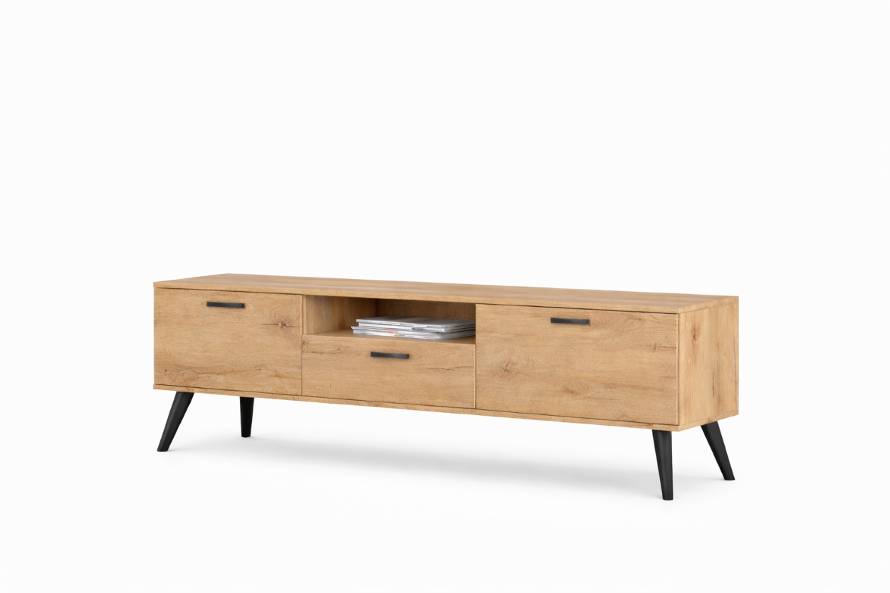 Έπιπλο τηλεόρασης με σύγχρονο και πρακτικό σχεδιασμό, κατάλληλο για κάθε καθιστικό. Διαθέτει κεντρικό ανοιχτό ράφι για ηλεκτρονικές συσκευές και δύο ευρύχωρα ντουλάπια για αποθήκευση αντικειμένων. Υπερυψωμένη βάση που διευκολύνει τον καθαρισμό και προσφέρει ανάλαφρη αισθητική στον χώρο.
