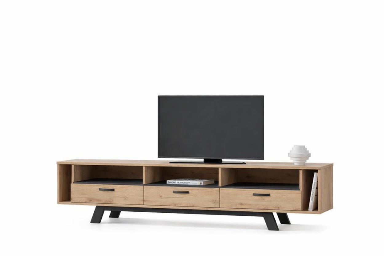 Έπιπλο τηλεόρασης με σύγχρονο και ευρύχωρο σχεδιασμό για οργανωμένο καθιστικό. Διαθέτει ανοιχτά ράφια για ηλεκτρονικές συσκευές και διακοσμητικά, καθώς και ντουλάπια για αποθήκευση αντικειμένων. Πρακτική κατασκευή που συνδυάζει λειτουργικότητα και άνετη εκμετάλλευση χώρου.
