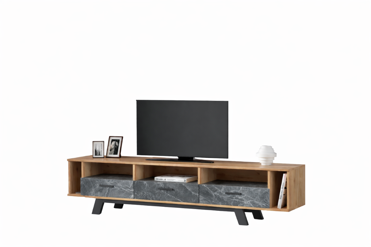 Έπιπλο τηλεόρασης με σύγχρονο και επιβλητικό σχεδιασμό, που συνδυάζει λειτουργικότητα και κομψότητα. Διαθέτει ανοιχτά ράφια για συσκευές και διακοσμητικά, καθώς και ευρύχωρα ντουλάπια για οργανωμένη αποθήκευση. Οι επιφάνειες με εφέ μαρμάρου προσθέτουν ιδιαίτερο χαρακτήρα και αναβαθμίζουν αισθητικά το καθιστικό.