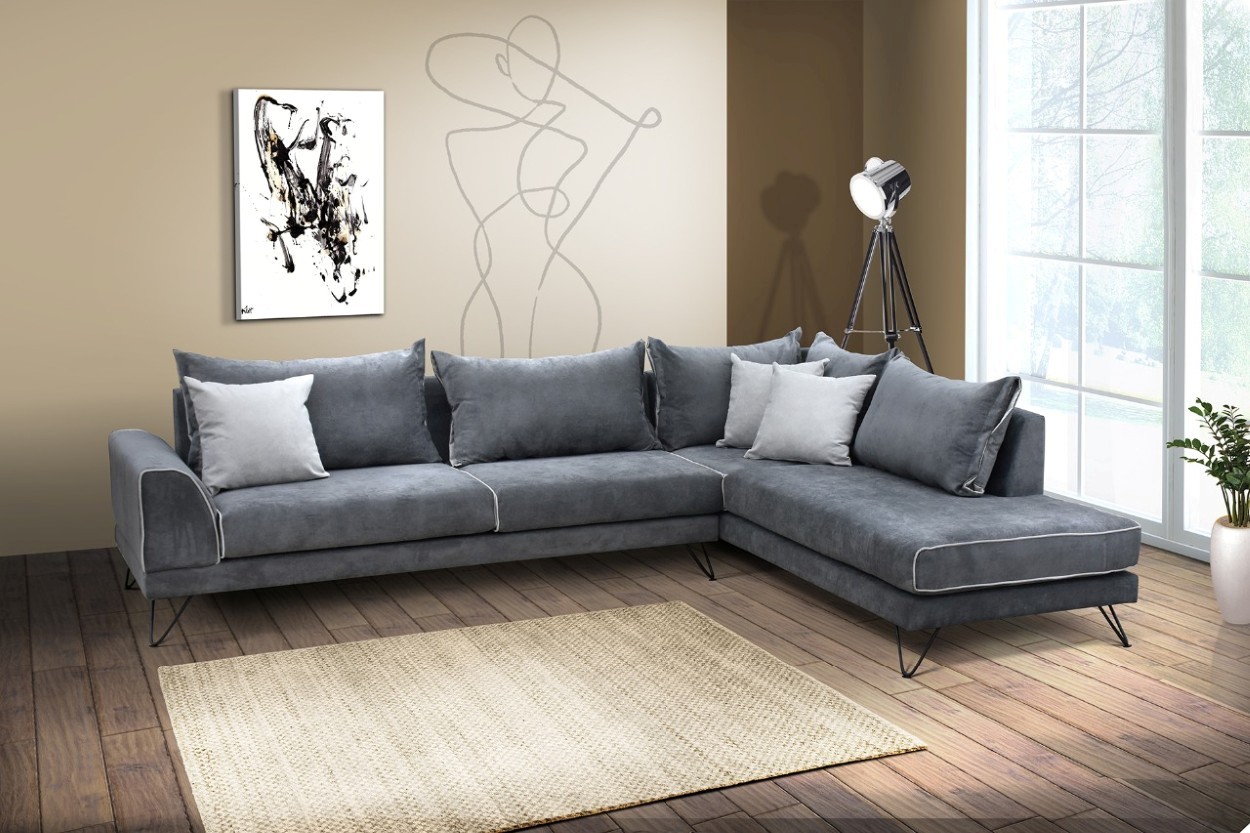 Γωνιακός καναπές με σύγχρονο σχεδιασμό και άνετη, ποιοτική κατασκευή, ιδανικός για καθημερινή χρήση και χαλάρωση. Οι καθαρές γραμμές και η προσεγμένη αισθητική του τον καθιστούν εύκολα προσαρμόσιμο σε κάθε σαλόνι, συνδυάζοντας στυλ και πρακτικότητα. Υπάρχει δυνατότητα ειδικής παραγγελίας στις διαστάσεις, ενώ διατίθενται πολλά χρωματολόγια και διαφορετικές ποιότητες υφασμάτων.