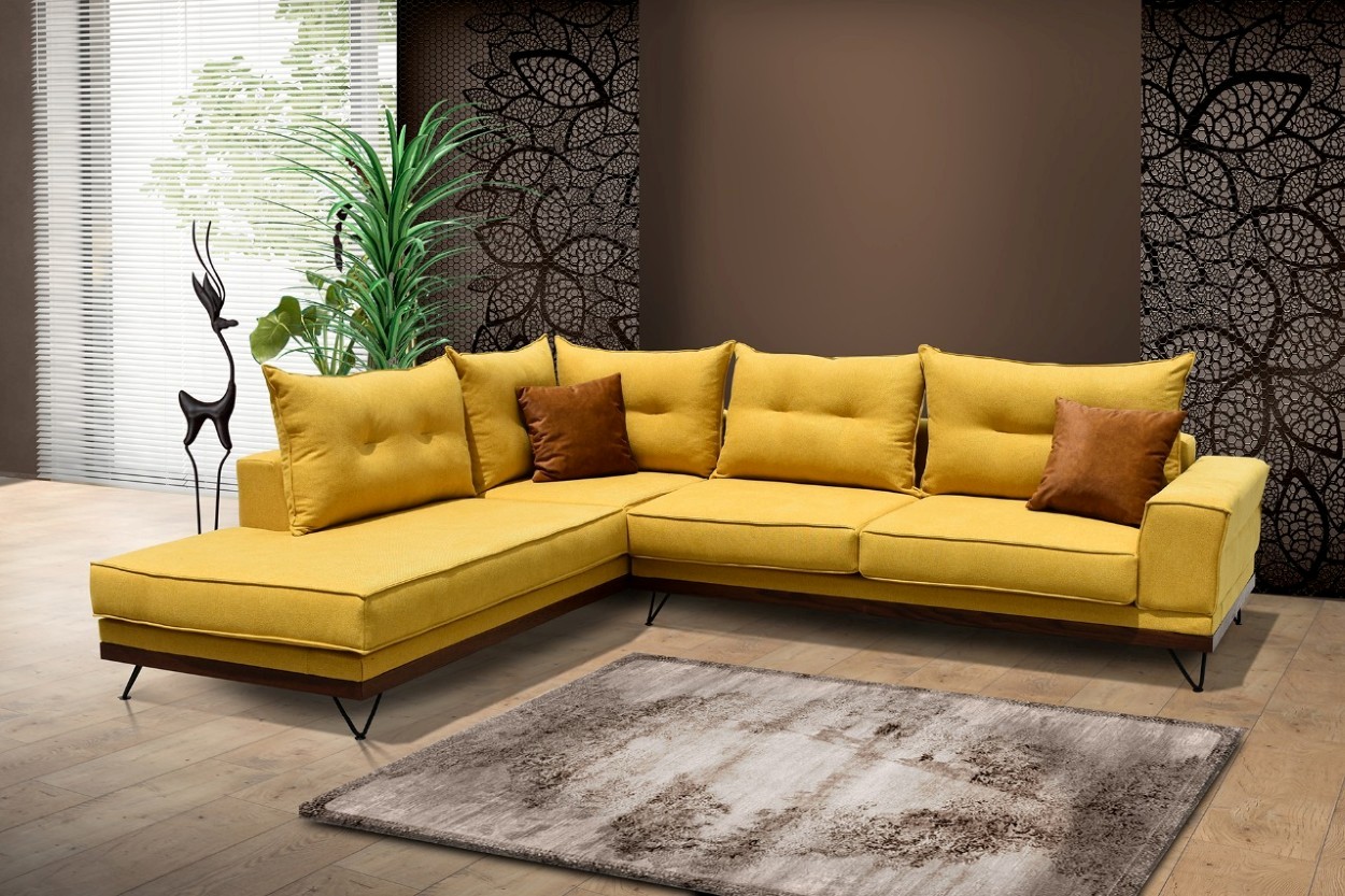 Γωνιακός καναπές με σύγχρονο σχεδιασμό και ζεστές λεπτομέρειες ξύλου στη βάση, που προσδίδουν φυσικό χαρακτήρα και κομψότητα στον χώρο. Η άνετη κατασκευή και οι αναπαυτικές επιφάνειες τον καθιστούν ιδανικό για καθημερινή χρήση και χαλάρωση. Υπάρχει δυνατότητα ειδικής παραγγελίας στις διαστάσεις, ενώ διατίθενται πολλά χρωματολόγια και διαφορετικές ποιότητες υφασμάτων.