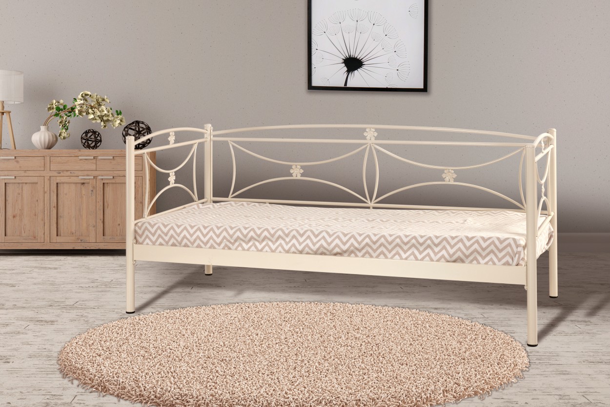 Σιδερένιος καναπές-κρεβάτι με ανάλαφρο και καλαίσθητο σχεδιασμό. Η πλάτη και τα πλαϊνά διακοσμούνται με συμμετρικές καμπύλες και λεπτά μεταλλικά στοιχεία που προσδίδουν ρομαντικό και διαχρονικό στυλ. Η σταθερή μεταλλική κατασκευή εξασφαλίζει αντοχή και άνεση, καθιστώντας το ιδανικό για χρήση ως καναπές ή μονό κρεβάτι σε κάθε χώρο.