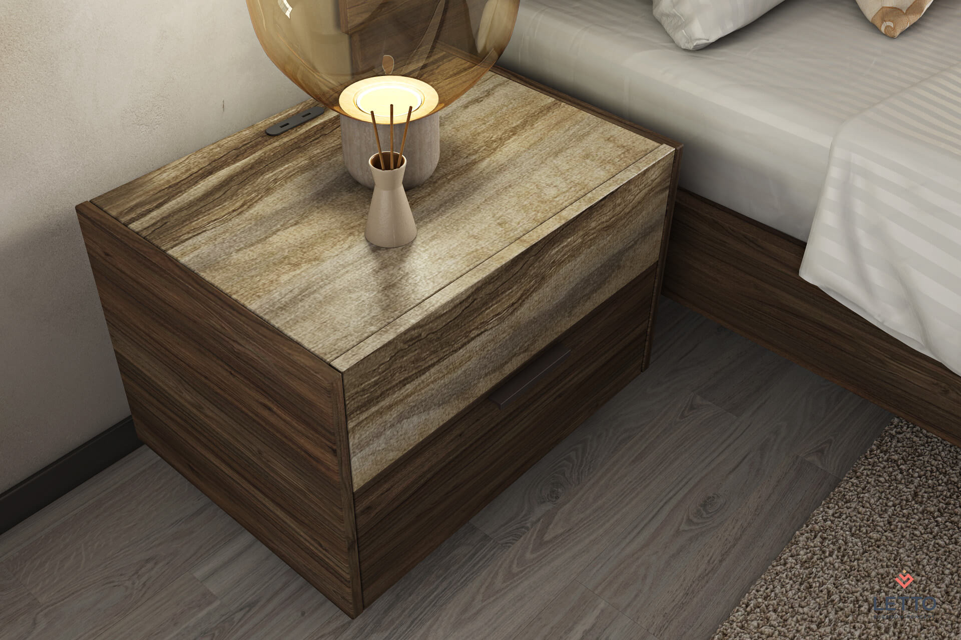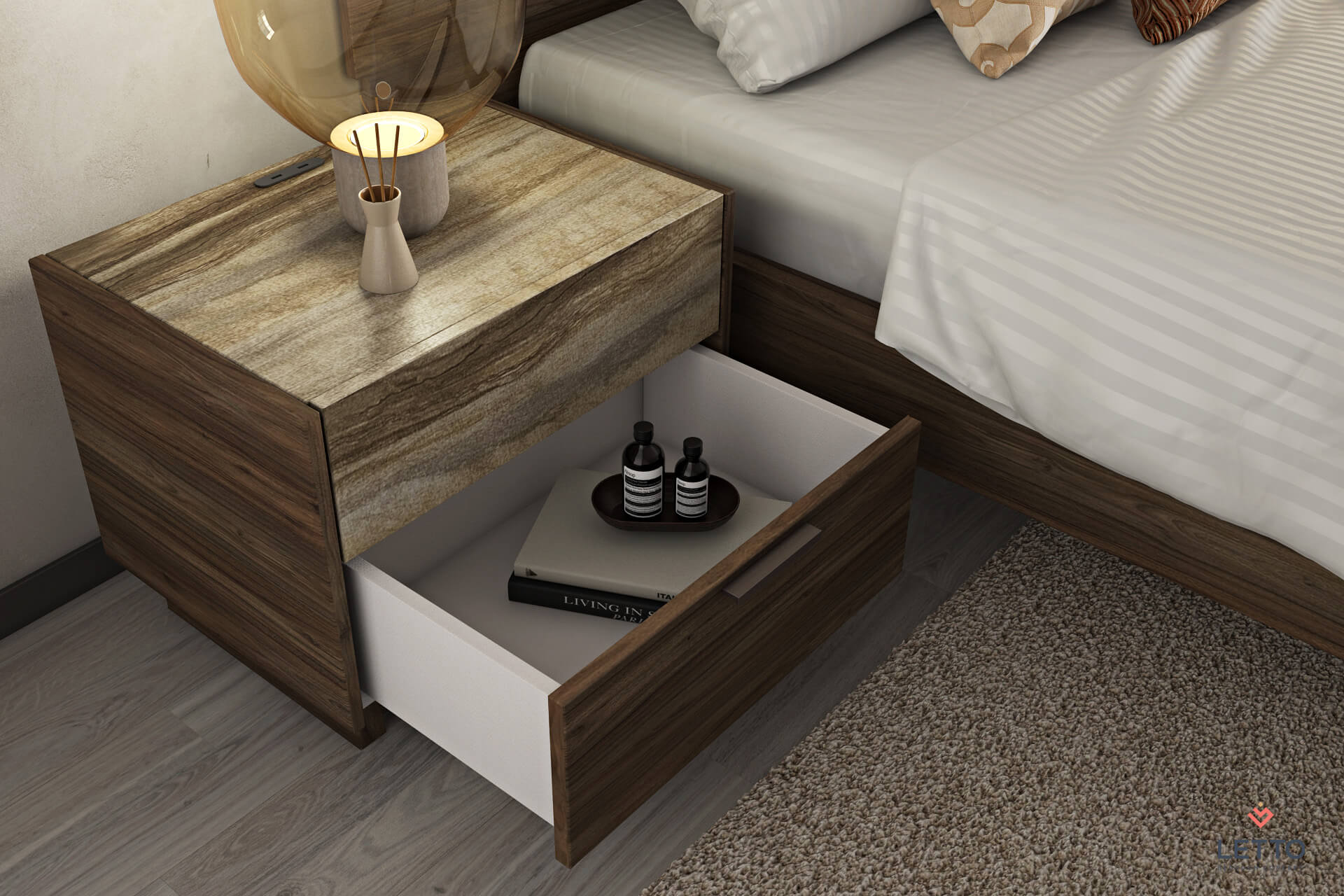 Το κομοδίνο διαθέτει δύο συρτάρια αποθήκευσης, το εσωτερικών των οποίων είναι κατασκευασμένο από ανάγλυφη μελαμίνη σε linen beige χρώμα, ενώ οι μηχανισμοί είναι ρόδας Teflon ιταλικής προέλευσης. Επίσης, μπορούν να τοποθετηθούν μηχανισμοί soft close για αθόρυβη λειτουργία.
