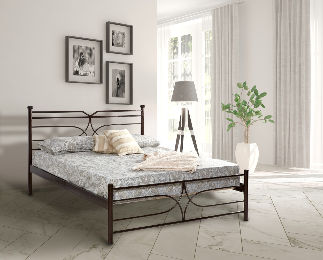Σιδερένιο κρεβάτι με κομψό και διαχρονικό σχεδιασμό. Το κεφαλάρι και το ποδαρικό διαθέτουν καμπύλες γραμμές και συμμετρικά μεταλλικά μοτίβα που προσδίδουν κλασικό και εκλεπτυσμένο ύφος. Η στιβαρή μεταλλική κατασκευή εξασφαλίζει σταθερότητα και αντοχή, αποτελώντας ιδανική επιλογή για κάθε υπνοδωμάτιο.