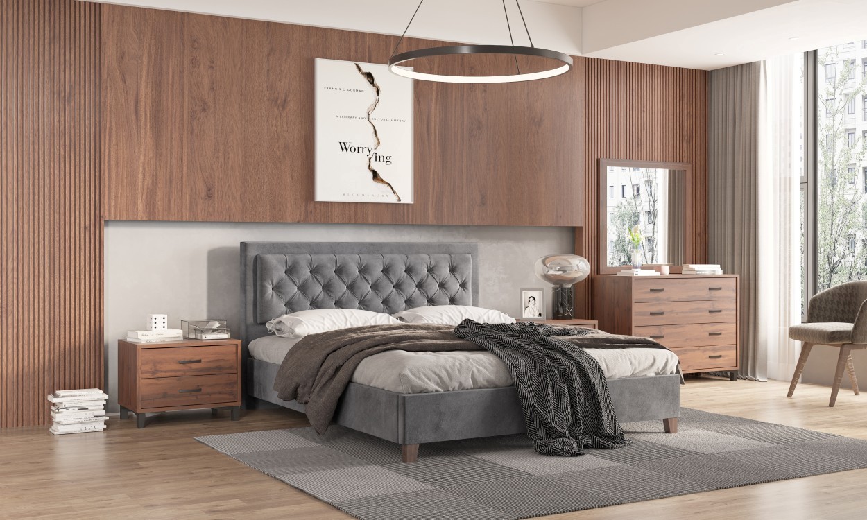 Κρεβάτι με πλήρως επενδυμένη υφασμάτινη κατασκευή και εντυπωσιακό καπιτονέ κεφαλάρι που προσφέρει πολυτελή αίσθηση και άνεση. Η στιβαρή δομή και ο μοντέρνος σχεδιασμός του το καθιστούν ιδανική επιλογή για κάθε σύγχρονο υπνοδωμάτιο.