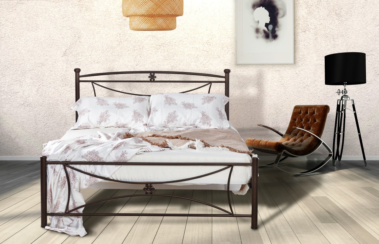 Σιδερένιο κρεβάτι με κομψό και ρομαντικό σχεδιασμό. Το κεφαλάρι και το ποδαρικό διαθέτουν απαλές καμπύλες γραμμές και διακριτικά διακοσμητικά μεταλλικά στοιχεία, δημιουργώντας ένα διαχρονικό και εκλεπτυσμένο ύφος. Η στιβαρή μεταλλική κατασκευή εξασφαλίζει σταθερότητα και αντοχή, αποτελώντας ιδανική επιλογή για κάθε υπνοδωμάτιο.
