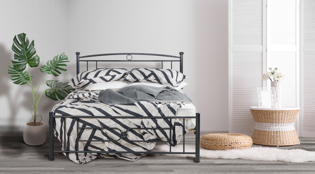 Σιδερένιο κρεβάτι με λιτό και κομψό σχεδιασμό. Το κεφαλάρι και το ποδαρικό διαθέτουν καθαρές γραμμές και διακριτικό γεωμετρικό μοτίβο, δημιουργώντας ένα μοντέρνο και διαχρονικό αποτέλεσμα. Η στιβαρή μεταλλική κατασκευή εξασφαλίζει σταθερότητα και αντοχή, ιδανική επιλογή για ένα καλαίσθητο υπνοδωμάτιο.