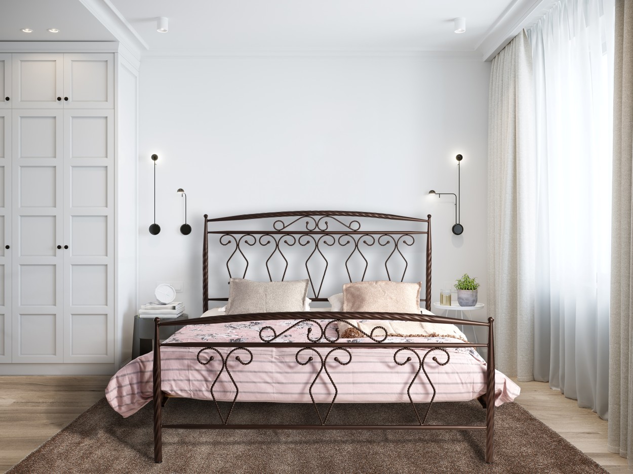 Σιδερένιο κρεβάτι από μασίφ σίδερο με κομψό και ανάλαφρο σχεδιασμό. Το κεφαλάρι και το ποδαρικό διαθέτουν καμπύλες γραμμές και διακριτικά διακοσμητικά στοιχεία, που προσδίδουν ρομαντικό χαρακτήρα και φωτεινή αισθητική στον χώρο. Η μασίφ μεταλλική κατασκευή εξασφαλίζει υψηλή αντοχή, σταθερότητα και στιβαρότητα, αποτελώντας ιδανική επιλογή για ένα καλαίσθητο και διαχρονικό υπνοδωμάτιο.