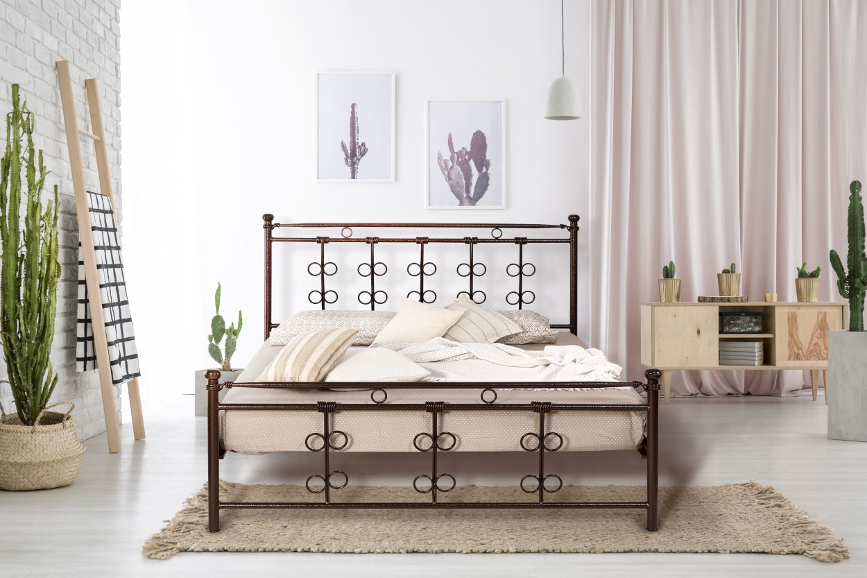 Σιδερένιο κρεβάτι με διαχρονικό και κομψό σχεδιασμό. Το κεφαλάρι και το ποδαρικό διακοσμούνται με συμμετρικά καμπύλα στοιχεία, προσδίδοντας ισορροπία και κομψότητα στον χώρο. Η μεταλλική κατασκευή εγγυάται υψηλή αντοχή, σταθερότητα και μεγάλη διάρκεια ζωής, καθιστώντας το ιδανική επιλογή για ένα καλαίσθητο και λειτουργικό υπνοδωμάτιο.