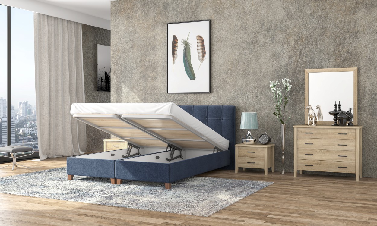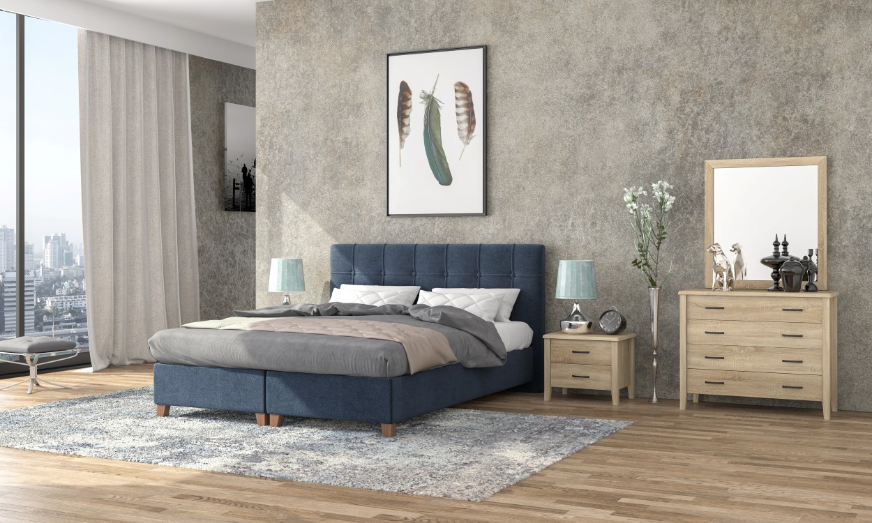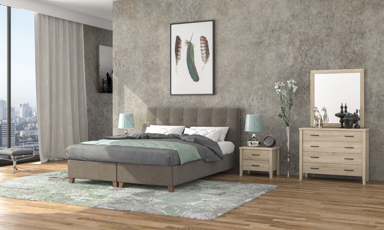 Κρεβάτι με υφασμάτινη επένδυση και καπιτονέ κεφαλάρι που προσφέρει άνεση και μοντέρνα αισθητική. Διαθέτει αποθηκευτικό χώρο, ιδανικό για πρακτική οργάνωση και εξοικονόμηση χώρου στο υπνοδωμάτιο.