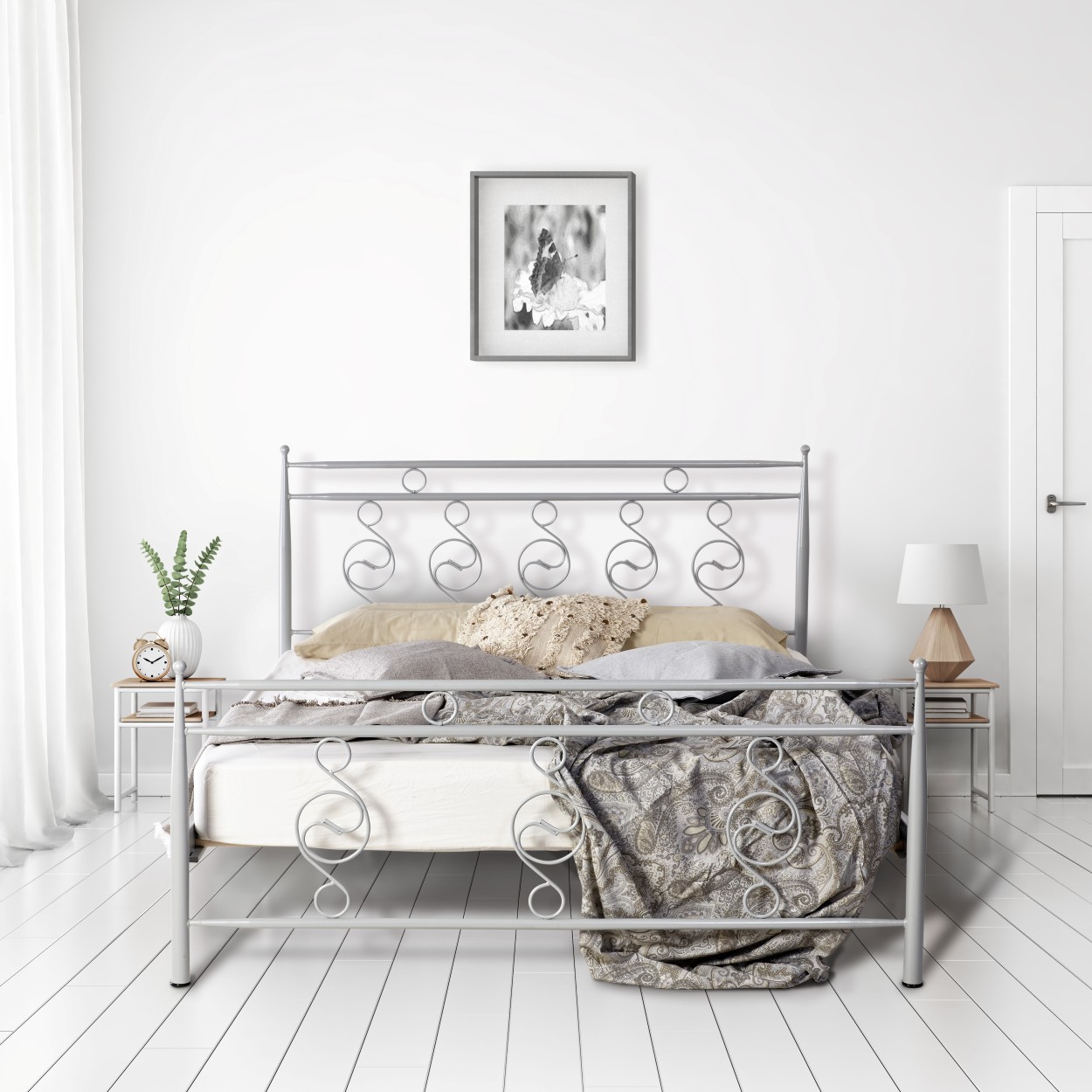 Σιδερένιο κρεβάτι από μασίφ σίδερο με ιδιαίτερο διακοσμητικό σχεδιασμό και καμπύλα στοιχεία στο κεφαλάρι και το ποδαρικό. Η μασίφ μεταλλική κατασκευή προσφέρει υψηλή αντοχή, στιβαρότητα και σταθερότητα, ενώ ο κομψός σχεδιασμός του το καθιστά ιδανική επιλογή για κλασικούς αλλά και πιο ρομαντικούς χώρους υπνοδωματίου. Συνδυάζει λειτουργικότητα και αισθητική, προσφέροντας άνεση και διαχρονικό στυλ.
