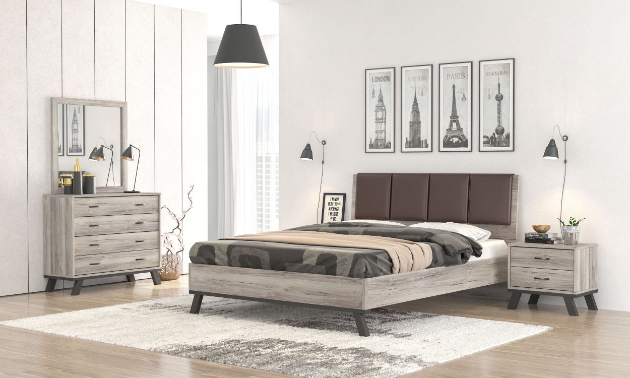 Κρεβάτι με σύγχρονο design και εντυπωσιακό επενδυμένο κεφαλάρι που προσφέρει άνεση και στυλ. Η σταθερή κατασκευή του και οι κομψές γραμμές του το καθιστούν ιδανικό για ένα μοντέρνο υπνοδωμάτιο.