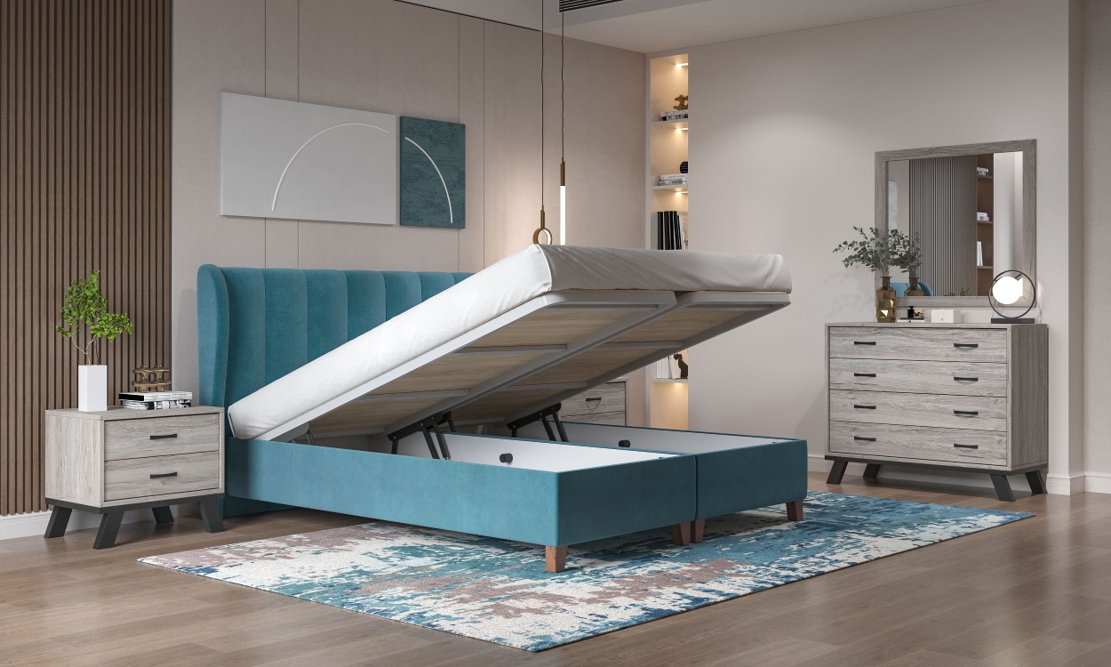 Κρεβάτι με υφασμάτινη επένδυση και καπιτονέ κεφαλάρι με κάθετες γραμμές που προσφέρει άνεση και μοντέρνα αισθητική. Διαθέτει αποθηκευτικό χώρο, ιδανικό για πρακτική οργάνωση και εξοικονόμηση χώρου στο υπνοδωμάτιο.
