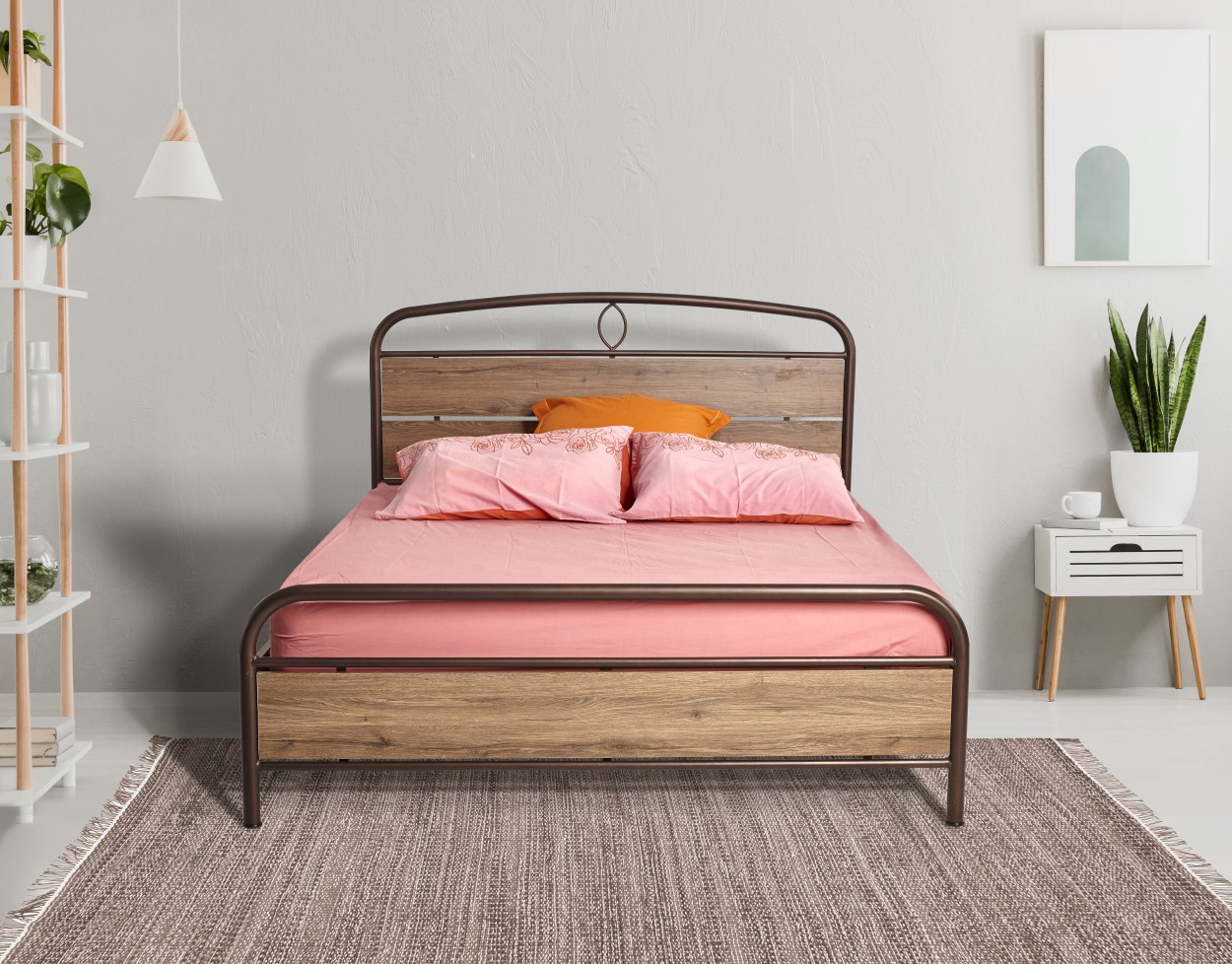 Μεταλλικό κρεβάτι από μασίφ σίδερο, με συνδυασμό μεταλλικού σκελετού και διακοσμητικών λεπτομερειών σε όψη ξύλου στο κεφαλάρι και το ποδαρικό, που προσδίδουν μοντέρνο και ζεστό χαρακτήρα. Η κατασκευή από μασίφ σίδερο εξασφαλίζει υψηλή αντοχή, σταθερότητα και μακροχρόνια χρήση, ενώ ο λιτός σχεδιασμός του το καθιστά ιδανικό για σύγχρονους και minimal χώρους.