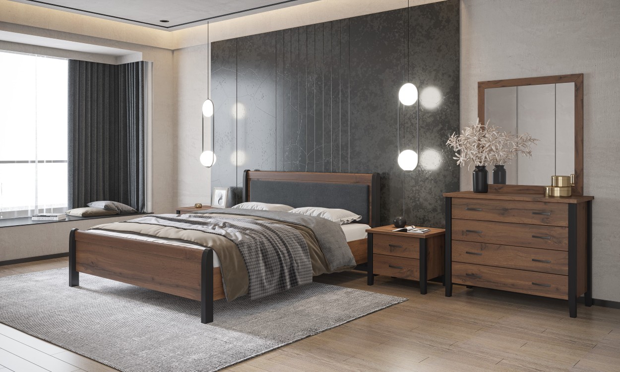 Κρεβάτι με μοντέρνο και κομψό σχεδιασμό, που συνδυάζει επενδυμένο κεφαλάρι και στιβαρή κατασκευή για άνεση και αντοχή. Οι καθαρές γραμμές του το καθιστούν ιδανική επιλογή για ένα σύγχρονο υπνοδωμάτιο.