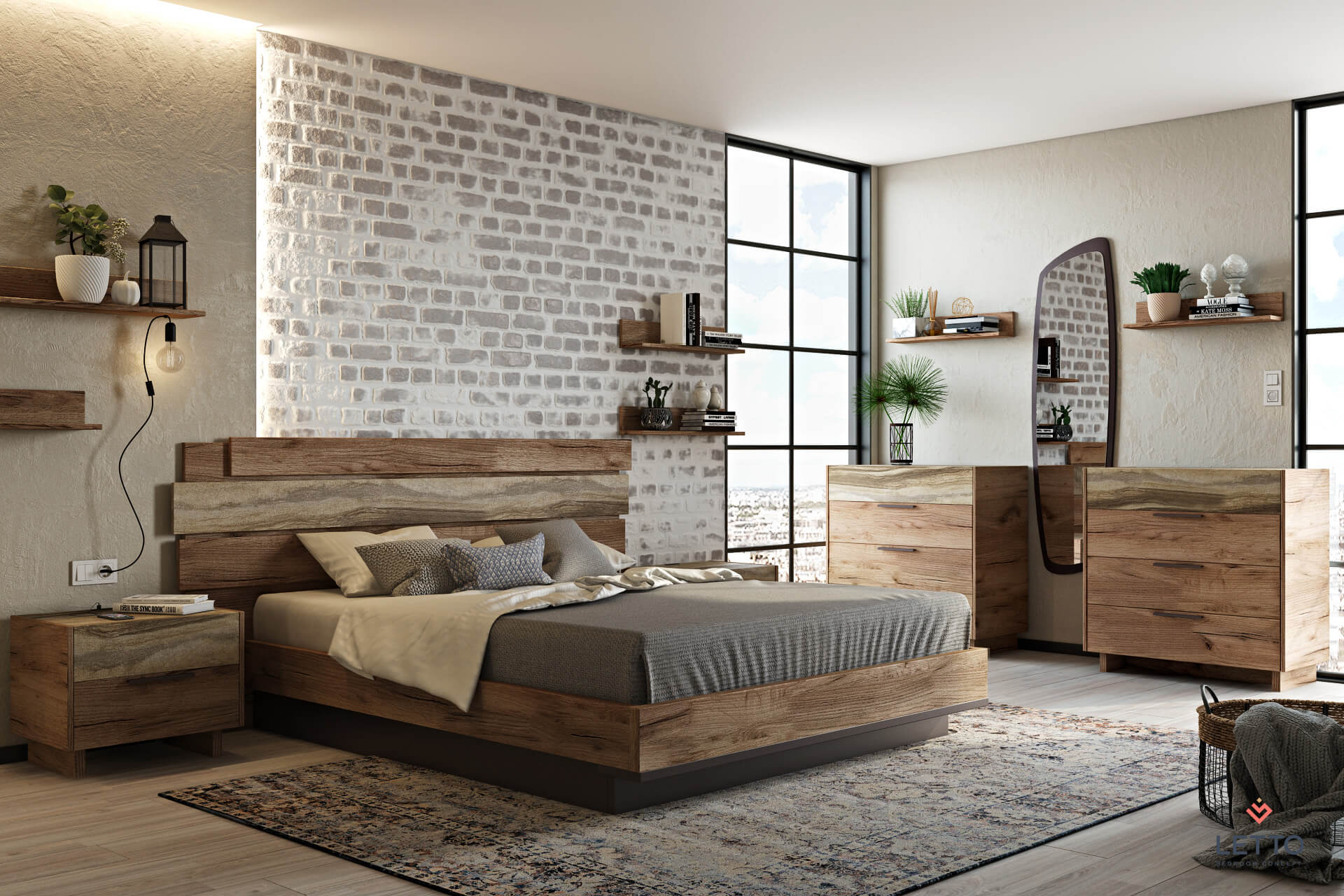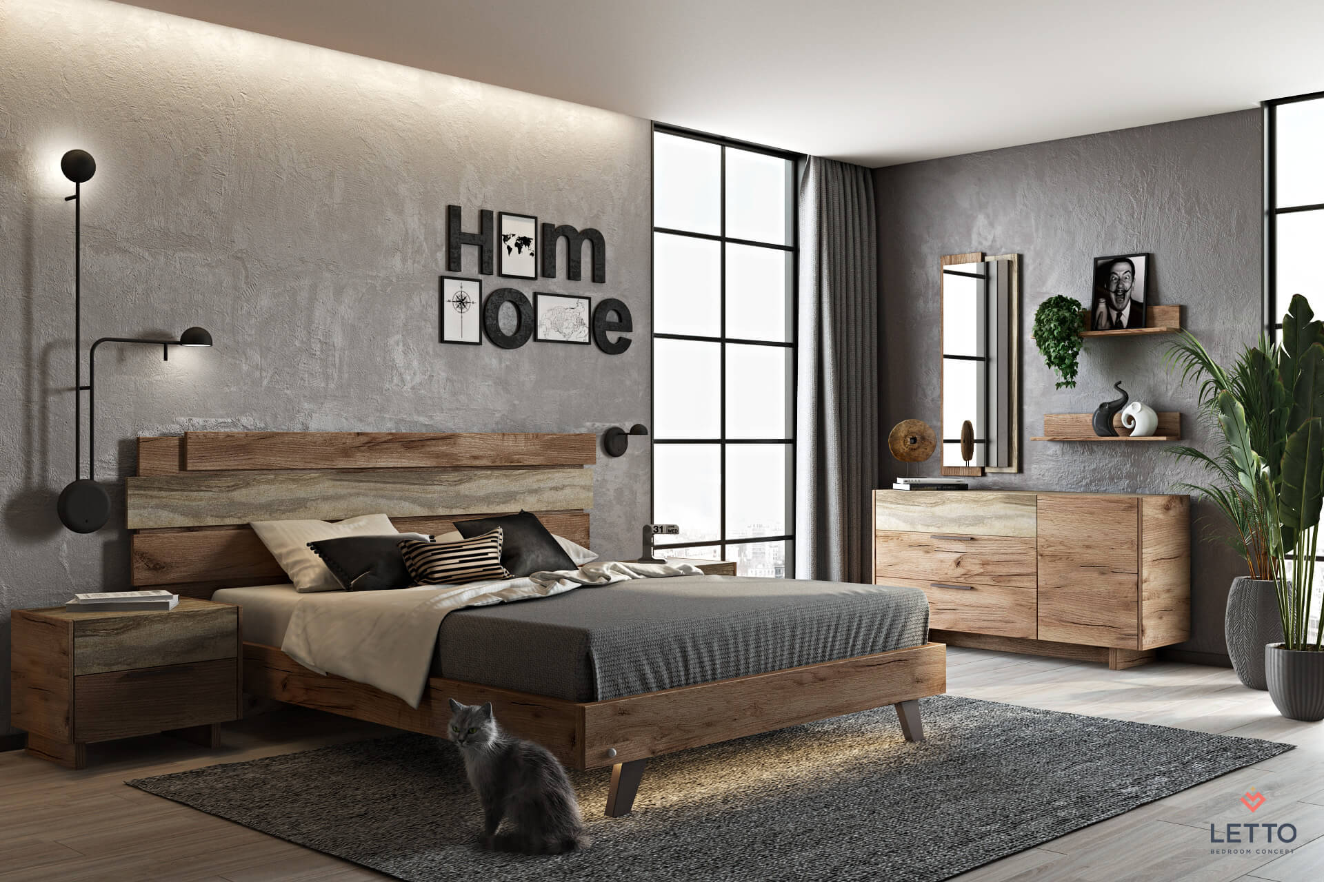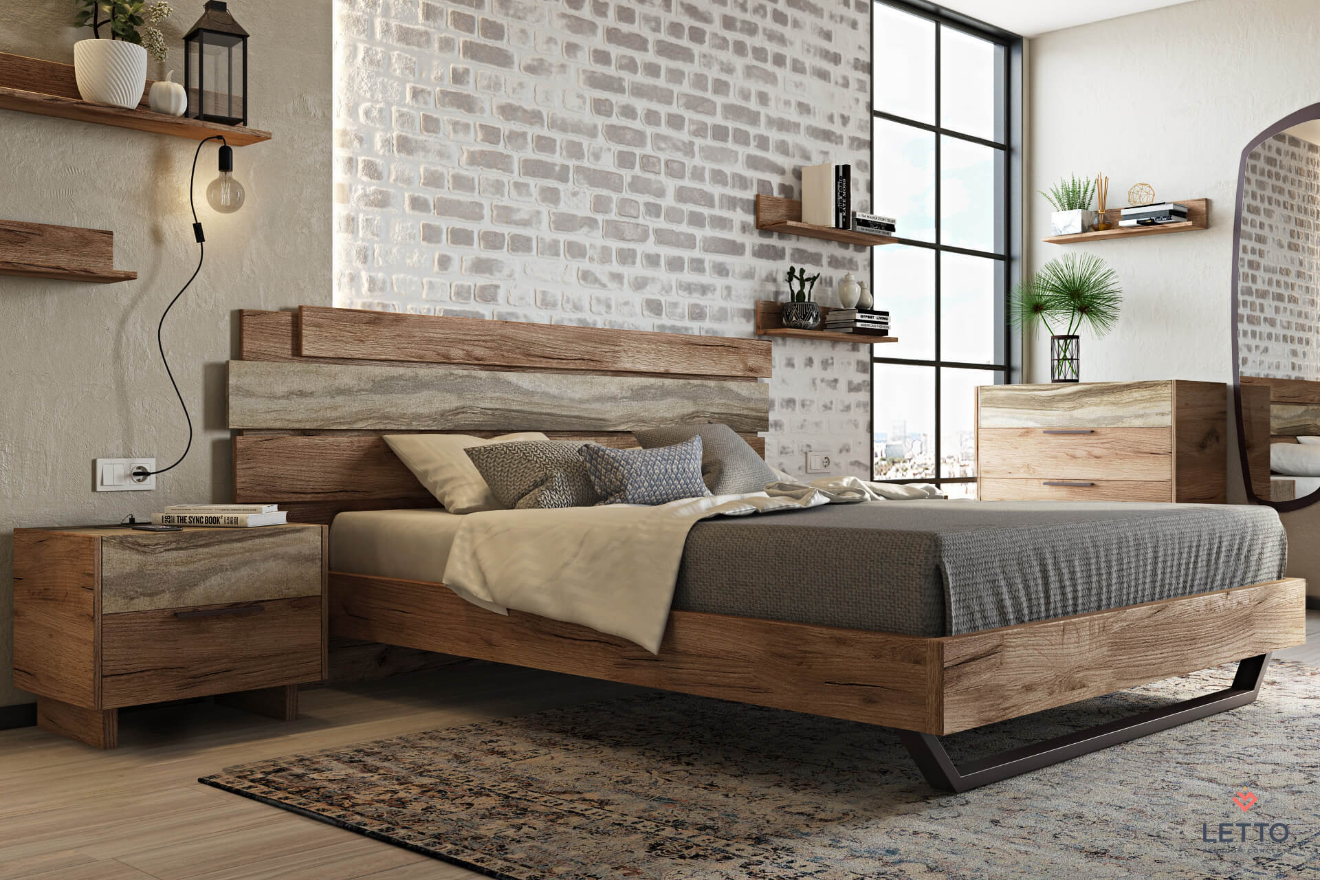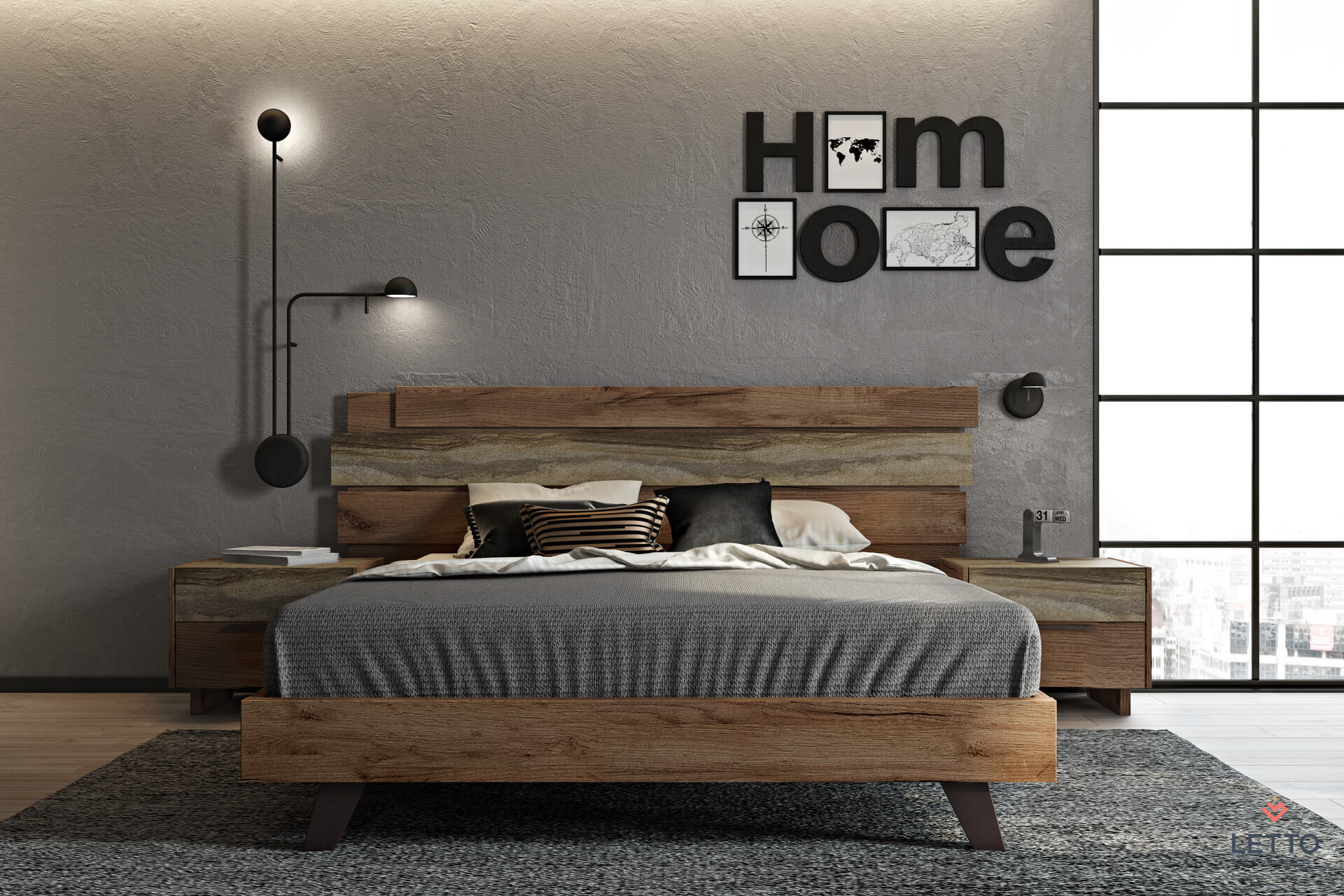 Το κρεβάτι Sicilia είναι κατασκευασμένο από τεχνητό καπλαμά χρώματα light brown rustic oak (m.22), σε συνδυασμό με την ιδιαίτερη ανάγλυφη διακοσμητική επιφάνεια στο κεφαλάρι. Στηρίζεται σε ξύλινα λακαριστά πόδια graphite grey χρώματος, αλλά υπάρχει και η δυνατότητα προσθήκης μεταλλικής βάσης στήριξης σε truffle brown χρώμα.