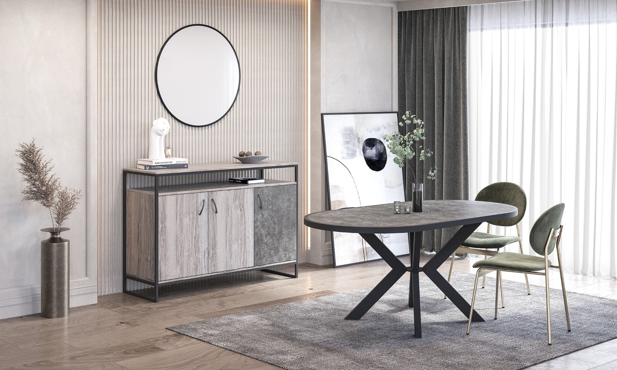 Μπουφές με μοντέρνο industrial χαρακτήρα που συνδυάζει μεταλλικό πλαίσιο με ντουλάπια σε εφέ μαρμάρου και ξύλου. Η ανοιχτή επάνω επιφάνεια προσφέρει χώρο για διακόσμηση, ενώ τα κλειστά ντουλάπια κρατούν τα πάντα οργανωμένα. Ένα ιδιαίτερο έπιπλο που δίνει δυναμικό στυλ στην τραπεζαρία.