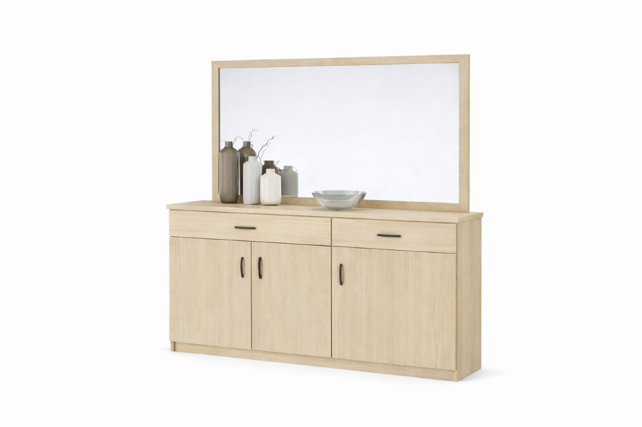 Κομψός μπουφές με καθρέφτη που ολοκληρώνει ιδανικά τη σύνθεση της τραπεζαρίας. Διαθέτει ευρύχωρους αποθηκευτικούς χώρους και σταθερή κατασκευή, προσφέροντας πρακτικότητα και στυλ. Ένα διαχρονικό έπιπλο που αναβαθμίζει αισθητικά τον χώρο.