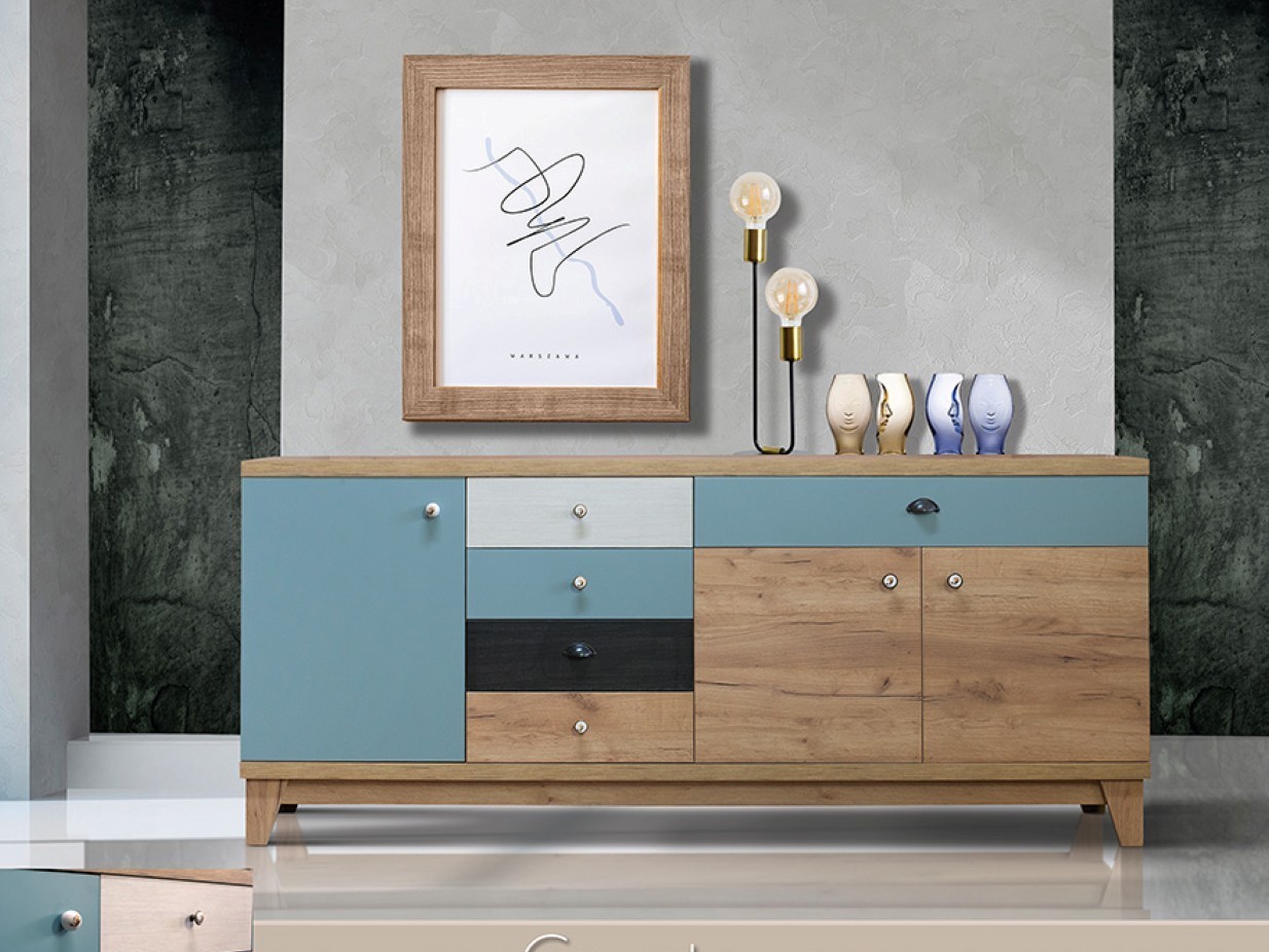 Μπουφές μοντέρνου σχεδιασμού με πολυμορφικούς αποθηκευτικούς χώρους, που ξεχωρίζει για τον ιδιαίτερο συνδυασμό επιφανειών και τη σύγχρονη αισθητική του. Διαθέτει συρτάρια διαφορετικών διαστάσεων και ντουλάπια για άνετη και οργανωμένη αποθήκευση αντικειμένων τραπεζαρίας ή σαλονιού. Ο δυναμικός σχεδιασμός του προσδίδει χαρακτήρα στον χώρο, ενώ η λειτουργικότητά του τον καθιστά ιδανική επιλογή για σύγχρονους και μοντέρνους εσωτερικούς χώρους.
