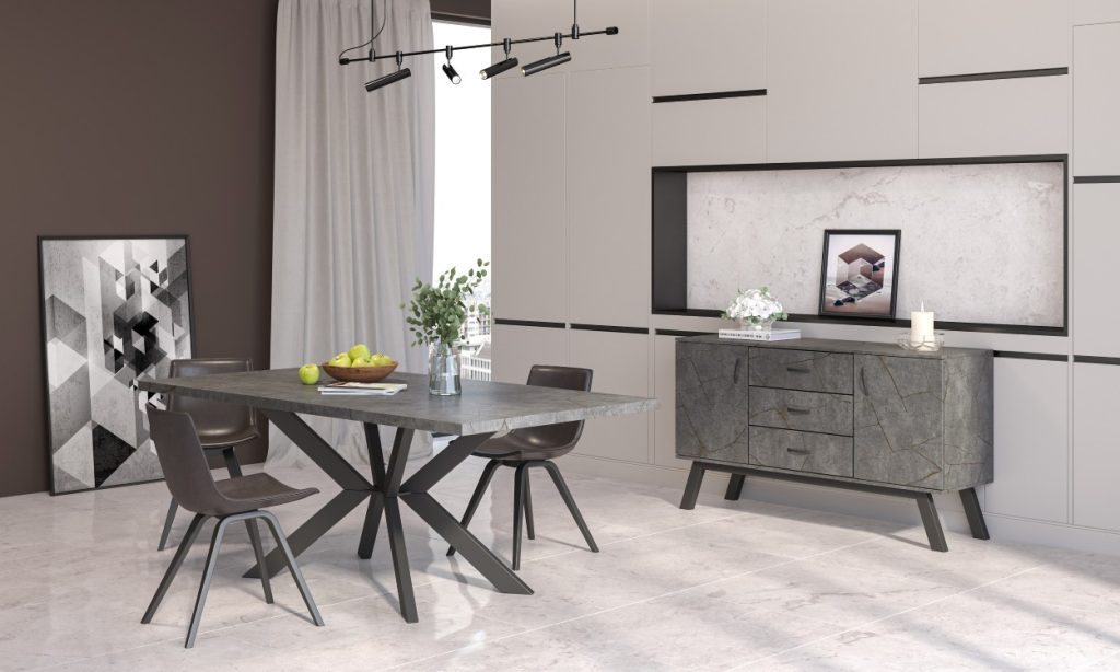 Μπουφές μοντέρνου σχεδιασμού με λιτή και επιβλητική αισθητική, που ξεχωρίζει για τον συμπαγή όγκο και τις καθαρές γραμμές του. Διαθέτει ευρύχωρα ντουλάπια που προσφέρουν άνετο αποθηκευτικό χώρο για σκεύη τραπεζαρίας και αντικείμενα καθημερινής χρήσης, συμβάλλοντας στην οργάνωση του χώρου. Ο διαχρονικός σχεδιασμός του τον καθιστά ιδανική επιλογή για σύγχρονους, minimal αλλά και industrial χώρους σαλονιού ή τραπεζαρίας.