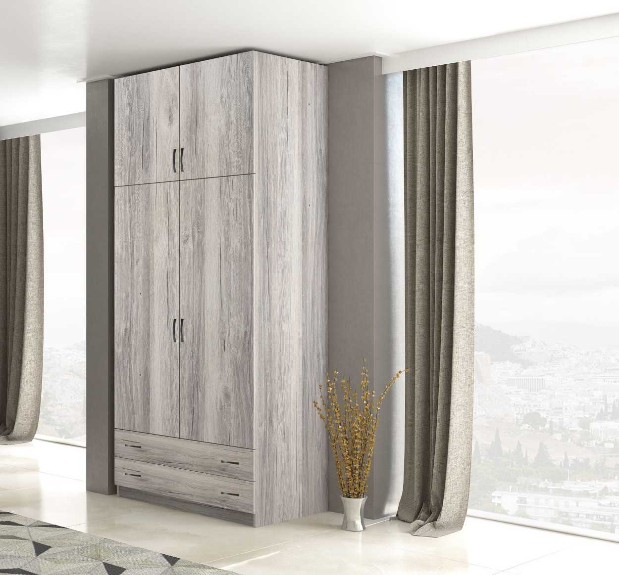 Λιτή και πρακτική δίφυλλη ντουλάπα με πατάρι, ιδανική για άνετη αποθήκευση σε περιορισμένους χώρους. Διαθέτει χώρο κρεμάσματος, ράφια και ενσωματωμένα συρτάρια, προσφέροντας πλήρη οργάνωση. Η ψηλή της κατασκευή και η minimal αισθητική προσθέτουν κομψότητα και λειτουργικότητα στο υπνοδωμάτιο.