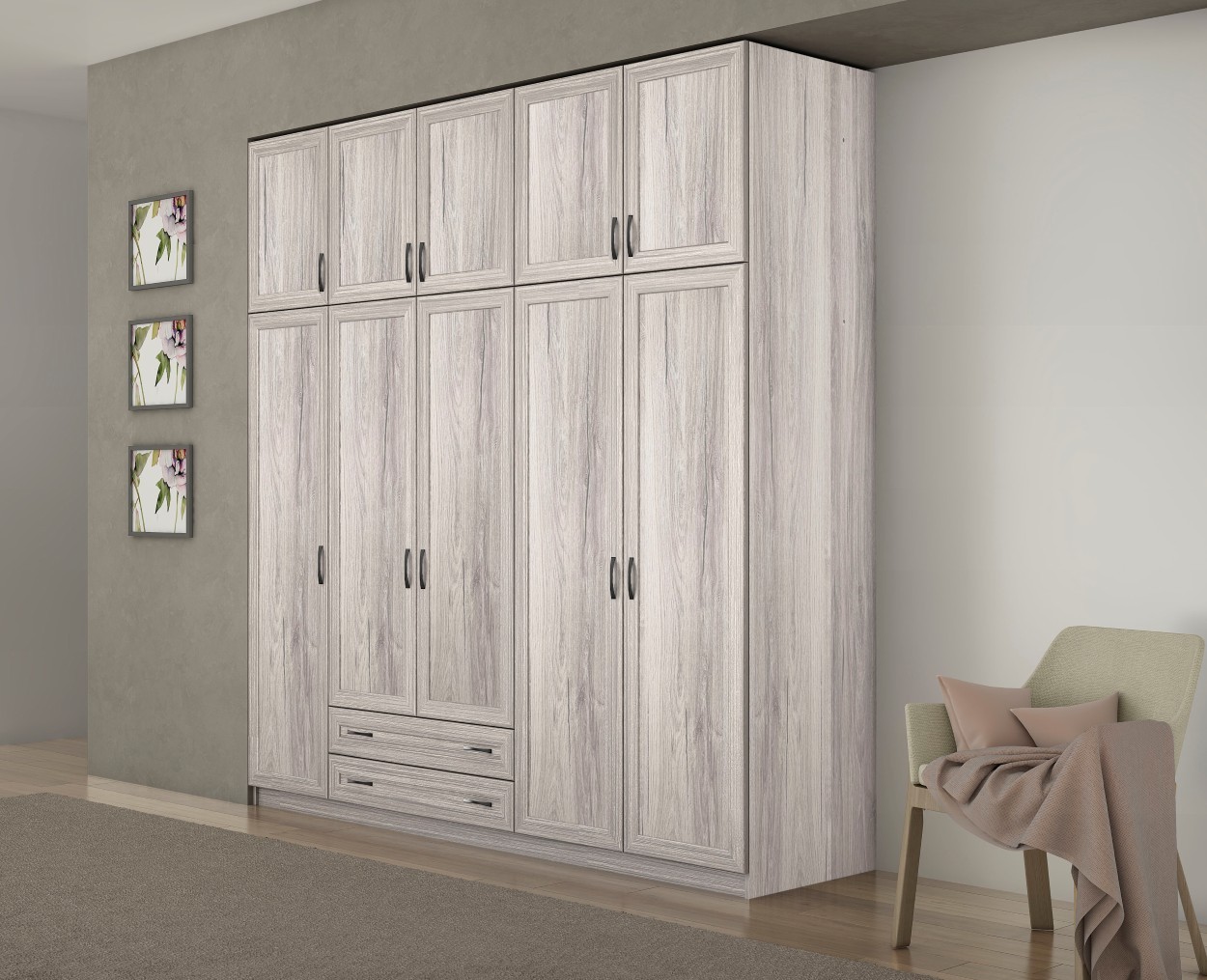 Ευρύχωρη πεντάφυλλη ντουλάπα με πατάρι και νταμπλά, σχεδιασμένη για απόλυτη οργάνωση του υπνοδωματίου. Διαθέτει πολλαπλούς χώρους κρεμάσματος, ράφια και ενσωματωμένα συρτάρια για πρακτική αποθήκευση κάθε αντικειμένου. Η ψηλή, minimal κατασκευή της προσφέρει επιβλητική παρουσία και αίσθηση πολυτέλειας στον χώρο.
