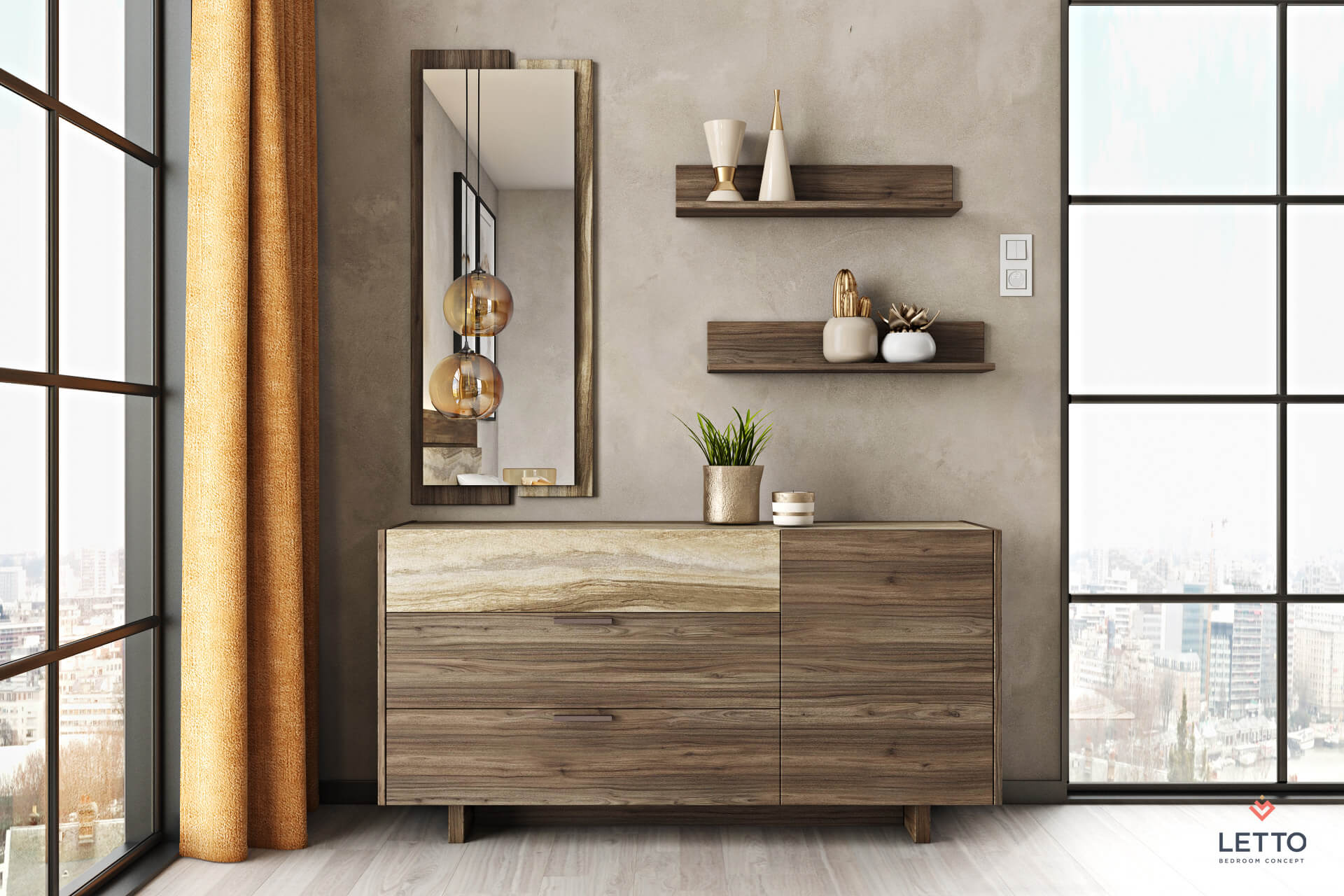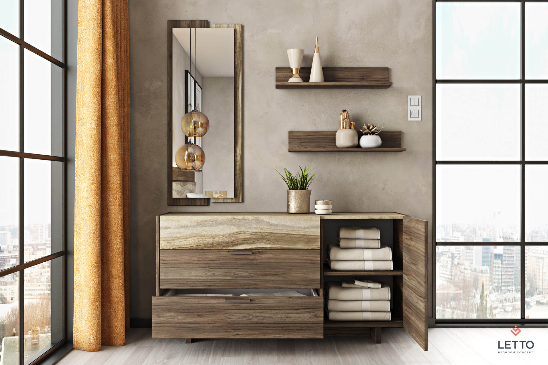 Το έπιπλο vanity Sicilia είναι μια εξαιρετική επιλογή για την αποθήκευση των προσωπικών σας αντικειμένων, καθώς διαθέτει τρία μεγάλα συρτάρια αποθήκευσης και ένα ντουλάπι. Κατασκευασμένο από τεχνητό καπλαμά σε tobacco walnut (m.19.1) χρώμα, συνδυάζεται άψογα με την διακοσμητική επιφάνεια που υπάρχει στο επάνω μέρος και την μπροστινή όψη του συρταριού. Όλα τα υλικά που χρησιμοποιούνται είναι υψηλών προδιαγραφών και διαθέτουν anti-scratch coating για μεγάλη αντοχή στα χτυπήματα και το καθάρισμα.