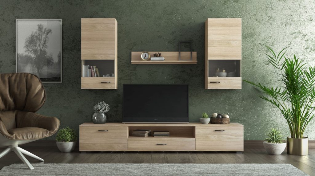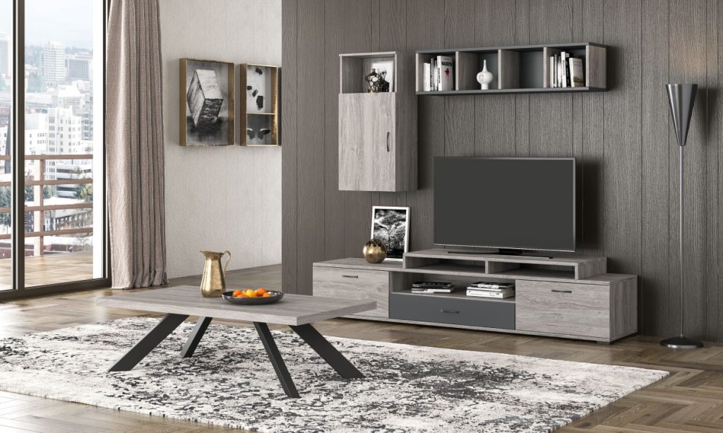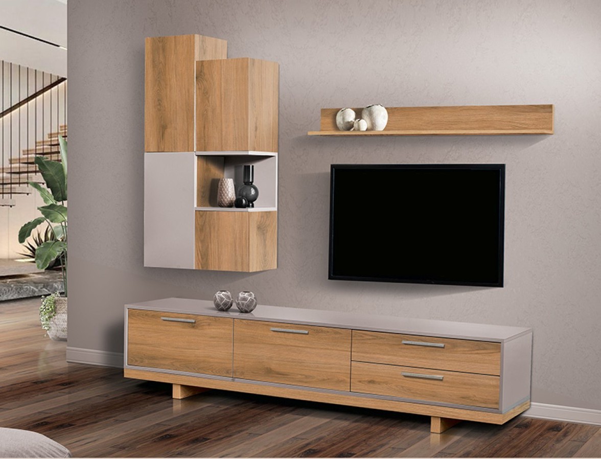 Σύνθετο σαλονιού μοντέρνου σχεδιασμού, με κομψό συνδυασμό φυσικής ξύλινης υφής και ανοιχτόχρωμων επιφανειών που δημιουργούν φωτεινό και ισορροπημένο αποτέλεσμα. Περιλαμβάνει χαμηλό έπιπλο TV με ευρύχωρα συρτάρια, κρεμαστό ντουλάπι και ράφι τοίχου για διακοσμητικά, προσφέροντας πρακτικότητα και καθαρές γραμμές. Ιδανικό για σύγχρονα σαλόνια με minimal αισθητική.