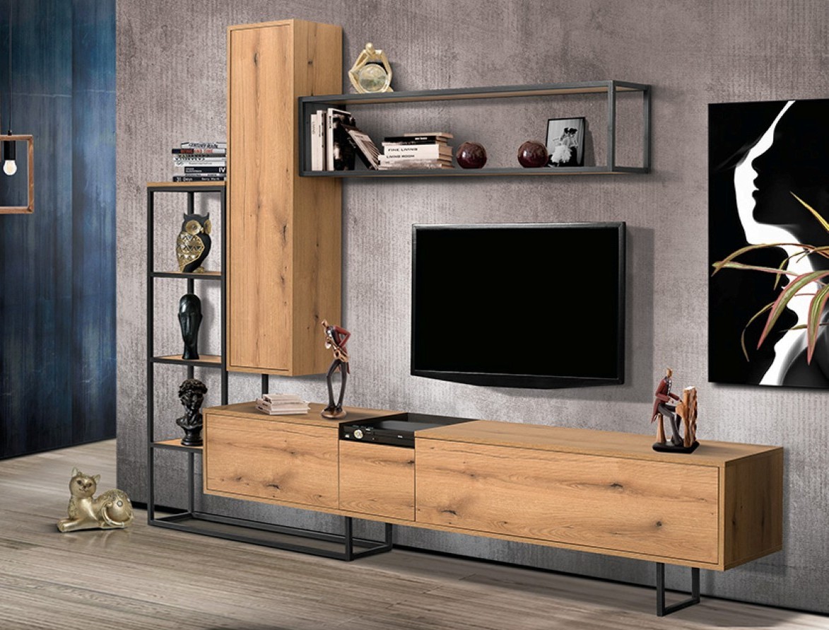 Σύνθεση σαλονιού μοντέρνου industrial σχεδιασμού, με βάση τηλεόρασης, κάθετη στήλη και ανοιχτά επιτοίχια ράφια, που δημιουργούν ένα δυναμικό και καλαίσθητο σύνολο. Ο συνδυασμός λιτών γραμμών και μεταλλικών λεπτομερειών προσφέρει σταθερότητα και σύγχρονη αισθητική, ενώ ο άνετος αποθηκευτικός χώρος καλύπτει τις ανάγκες οργάνωσης και προβολής διακοσμητικών στοιχείων. Ιδανική επιλογή για σύγχρονα καθιστικά με έμφαση στη λειτουργικότητα και το design.