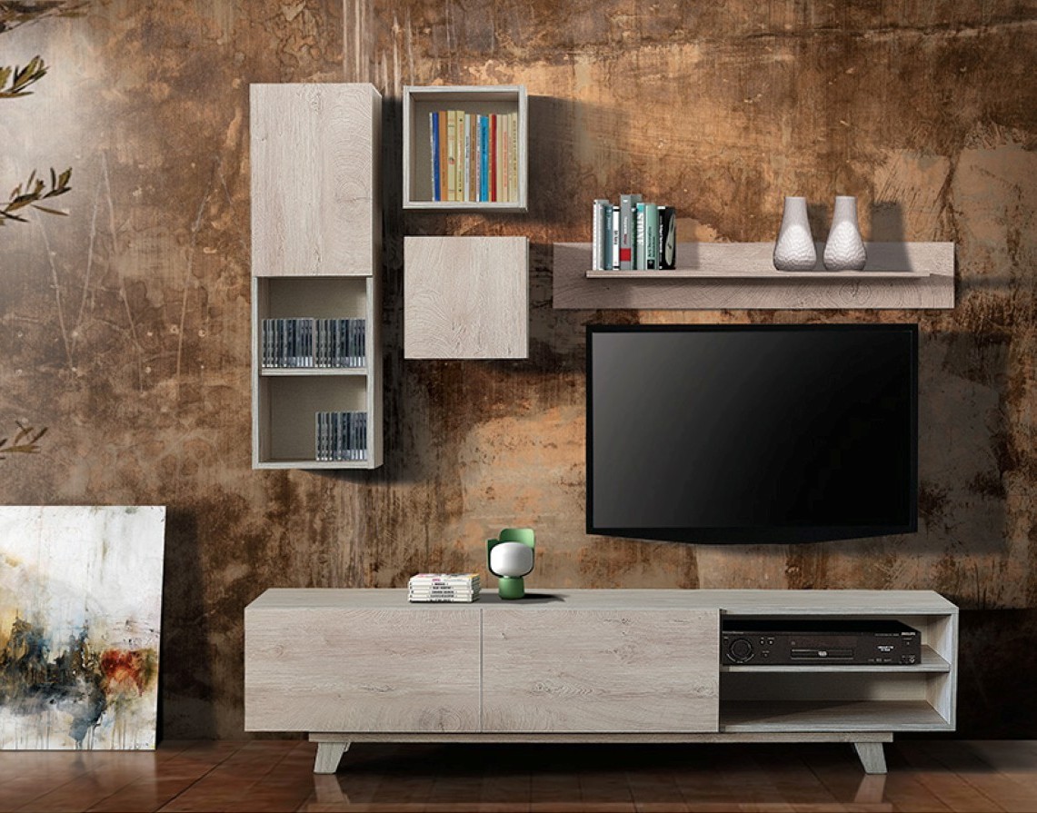 Σύνθεση σαλονιού σύγχρονου σχεδιασμού, με βάση τηλεόρασης και επιτοίχια στοιχεία που συνδυάζουν αρμονικά τη λειτουργικότητα με την αισθητική. Οι καθαρές γραμμές και οι ήπιες αποχρώσεις δημιουργούν ένα φωτεινό και κομψό αποτέλεσμα, ενώ ο αποθηκευτικός χώρος προσφέρει άνεση για την οργάνωση ηλεκτρονικών συσκευών, βιβλίων και διακοσμητικών.