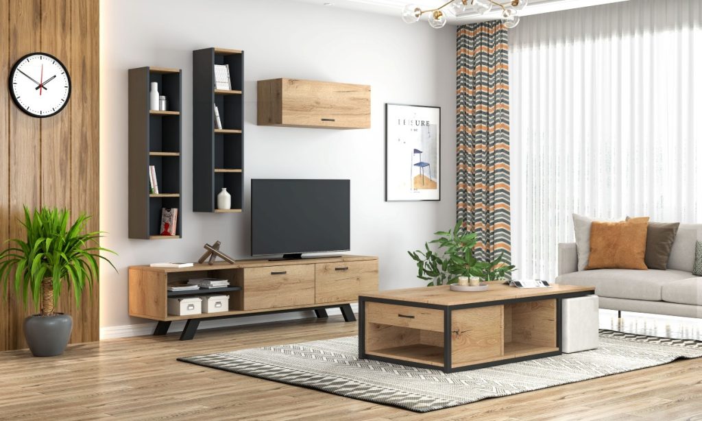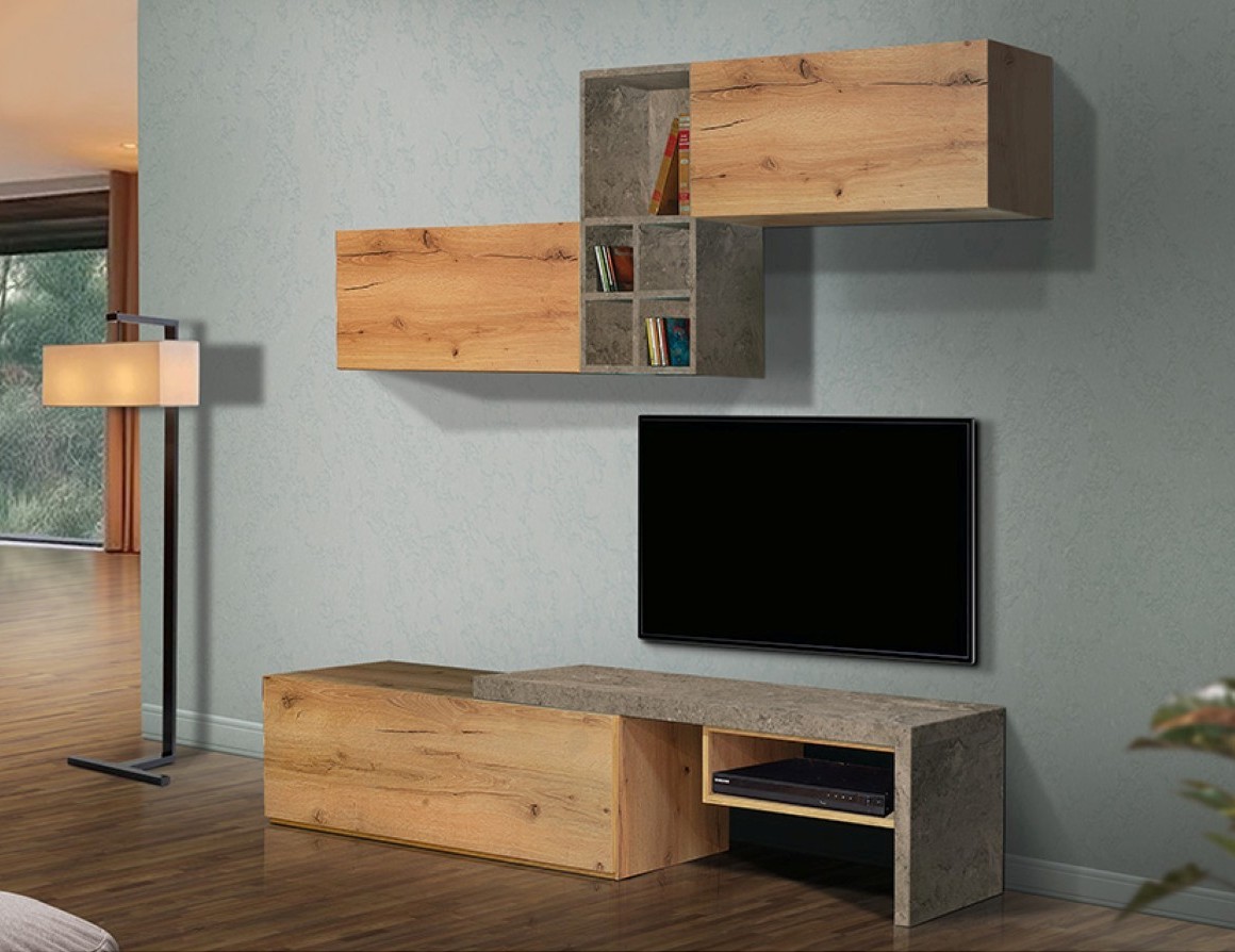 Σύνθετο σαλονιού σύγχρονου minimal σχεδιασμού, με ιδιαίτερο συνδυασμό φυσικής ξύλινης υφής και cement-look επιφανειών για μοντέρνο και αρχιτεκτονικό αποτέλεσμα. Περιλαμβάνει χαμηλό έπιπλο TV με αποθηκευτικό χώρο, καθώς και κρεμαστά ντουλάπια και ανοιχτά ράφια που προσφέρουν πρακτικότητα και αισθητική ισορροπία. Ιδανικό για σύγχρονα σαλόνια με minimal χαρακτήρα και design άποψη.