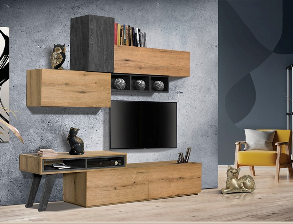 Σύνθετο σαλονιού μοντέρνου–industrial σχεδιασμού, με έντονο συνδυασμό φυσικής ξύλινης υφής και σκουρόχρωμων στοιχείων που προσδίδουν δυναμικό χαρακτήρα. Περιλαμβάνει χαμηλό έπιπλο TV με αποθηκευτικούς χώρους, κρεμαστά ντουλάπια και ανοιχτά ράφια για βιβλία και διακοσμητικά. Ιδανικό για σύγχρονα σαλόνια που αναζητούν ισορροπία ανάμεσα στο design και τη λειτουργικότητα.