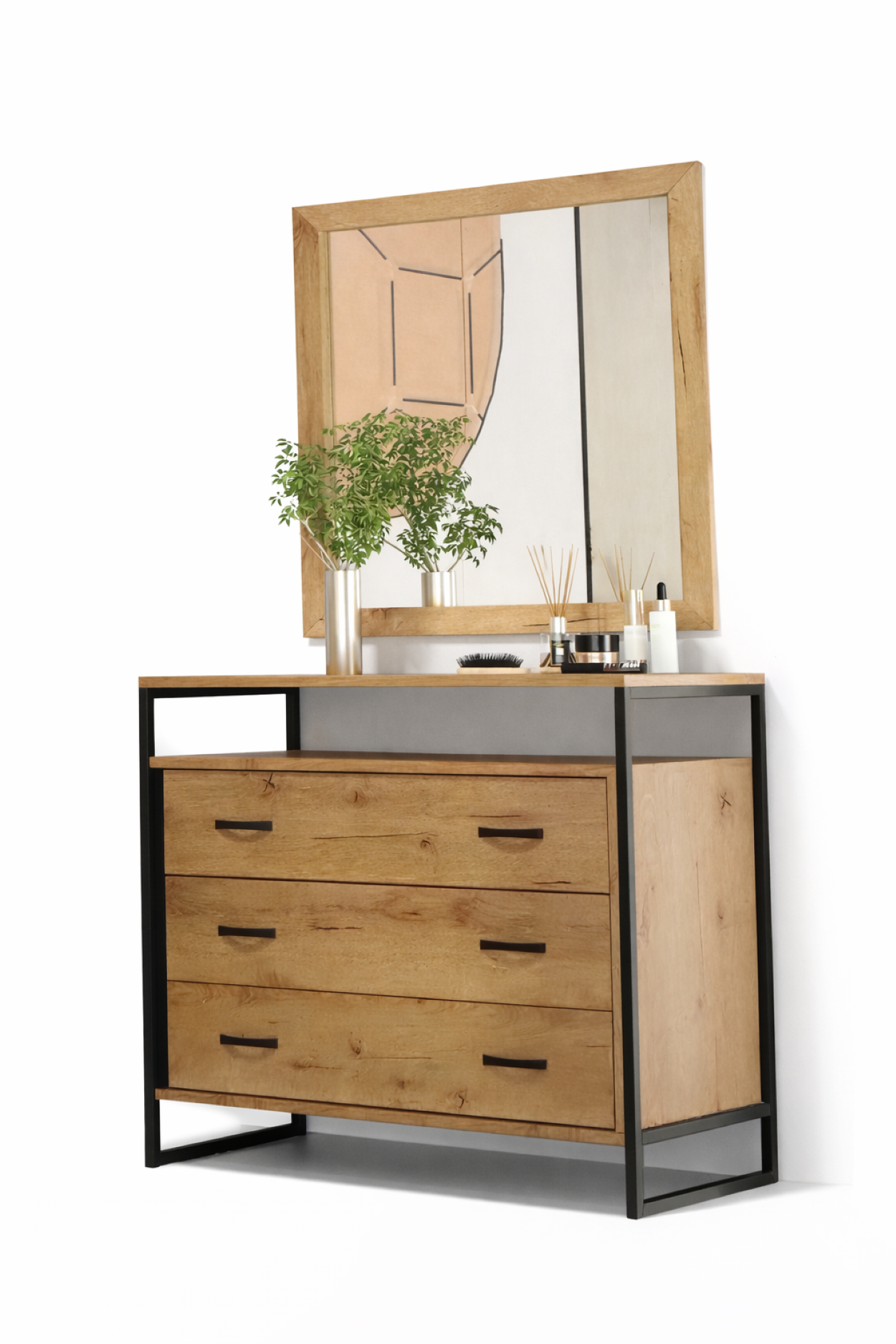 Μοντέρνα τουαλέτα με μεγάλο καθρέφτη και κομψή συρταριέρα, ιδανική για ολοκληρωμένη οργάνωση στο υπνοδωμάτιο. Διαθέτει πολλαπλά ευρύχωρα συρτάρια για αποθήκευση καλλυντικών και αξεσουάρ. Η minimal γραμμή και η κάθετη σύνθεση με τον καθρέφτη προσθέτουν αίσθηση πολυτέλειας και πρακτικότητας στον χώρο.