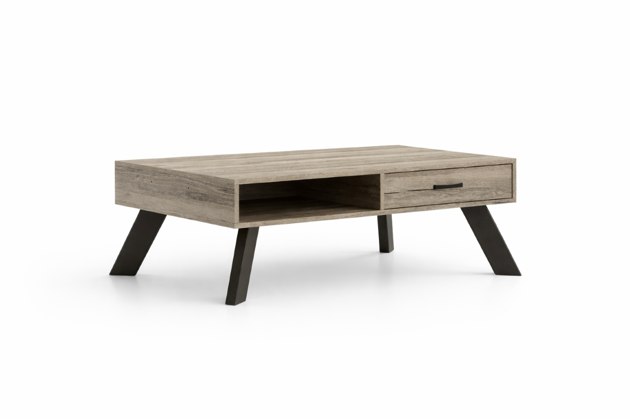 Μοντέρνο τραπεζάκι σαλονιού με λιτή, κομψή γραμμή και φυσική όψη ξύλου. Διαθέτει ανοιχτό αποθηκευτικό χώρο και συρτάρι για πρακτική οργάνωση, ενώ τα λοξά μεταλλικά πόδια προσφέρουν σταθερότητα και σύγχρονο στυλ. Ιδανικό για κάθε μοντέρνο ή minimal καθιστικό.