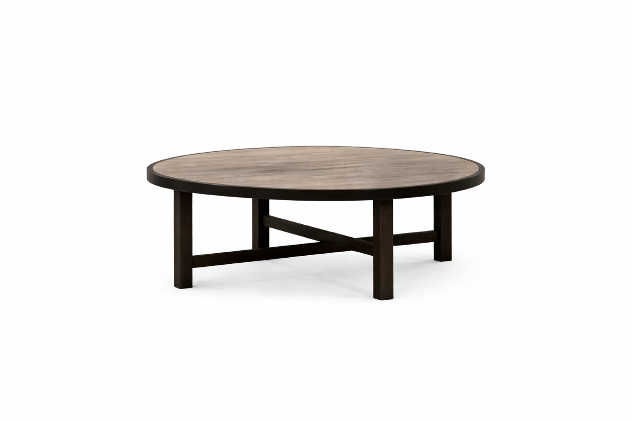 Στρογγυλό τραπεζάκι σαλονιού με φυσική ξύλινη επιφάνεια και μαύρο μεταλλικό σκελετό. Μοντέρνος σχεδιασμός, σταθερή κατασκευή και ιδανικό για κάθε σύγχρονο σαλόνι.