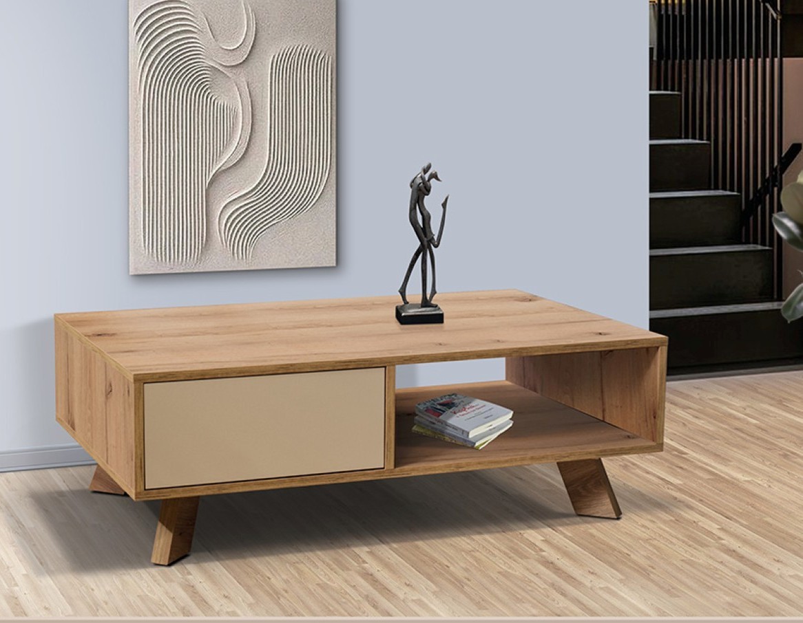 Τραπεζάκι σαλονιού σύγχρονου σχεδιασμού, που συνδυάζει τη φυσική ζεστασιά του ξύλου με minimal αισθητική. Διαθέτει συρτάρι με λιτή πρόσοψη για αποθήκευση μικροαντικειμένων, καθώς και ανοιχτό αποθηκευτικό χώρο ιδανικό για βιβλία και περιοδικά. Τα λοξά πόδια προσθέτουν χαρακτήρα και σταθερότητα, καθιστώντας το ιδανική επιλογή για μοντέρνα και λειτουργικά σαλόνια.