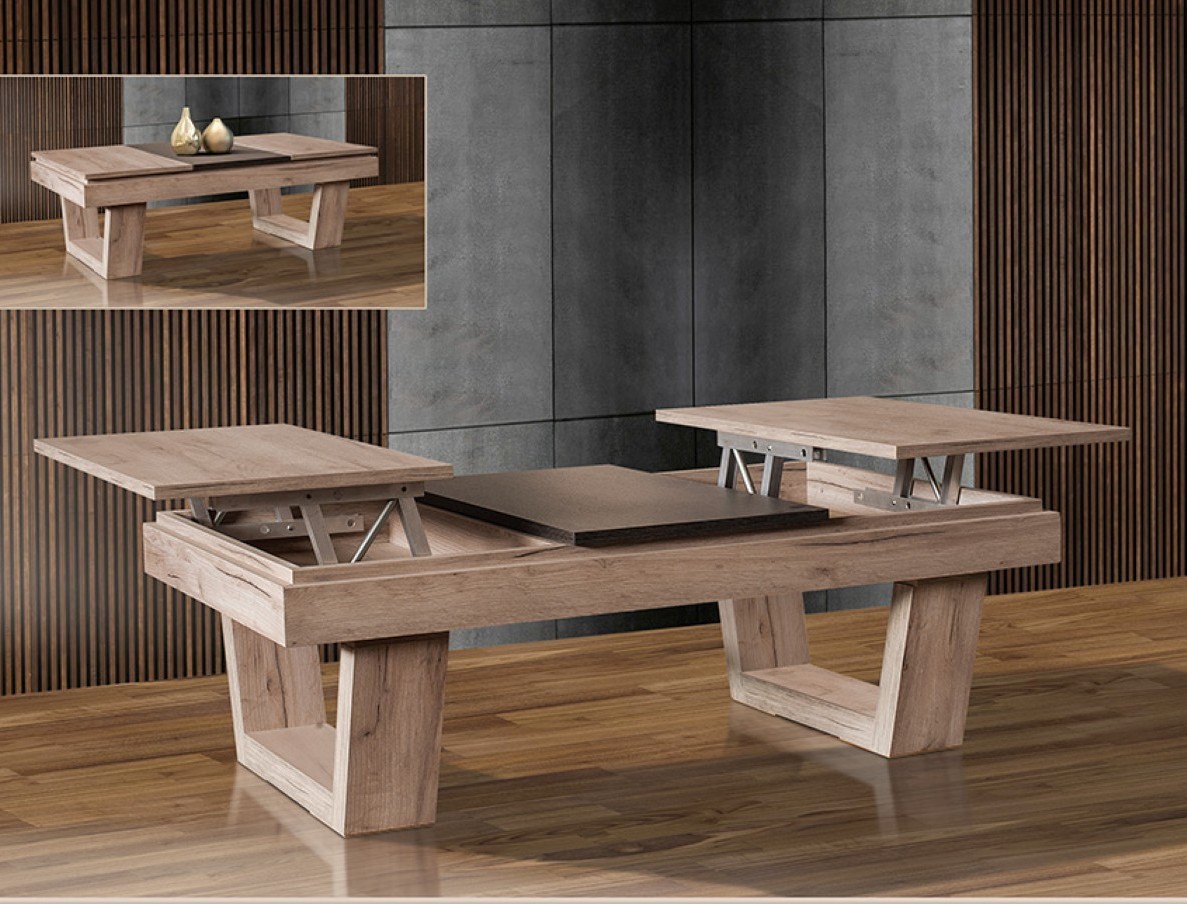 Τραπεζάκι σαλονιού με ανυψούμενες επιφάνειες, ιδανικό για όσους αναζητούν μέγιστη λειτουργικότητα και σύγχρονο design. Διαθέτει μηχανισμό ανύψωσης που μετατρέπει το τραπεζάκι σε πρακτικό χώρο εργασίας ή φαγητού, ενώ οι κρυφοί αποθηκευτικοί χώροι κάτω από τις επιφάνειες προσφέρουν άψογη οργάνωση. Ο στιβαρός σχεδιασμός και η φυσική ξύλινη όψη το καθιστούν ιδανικό για μοντέρνα σαλόνια με υψηλές απαιτήσεις.