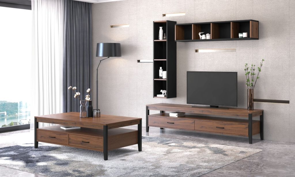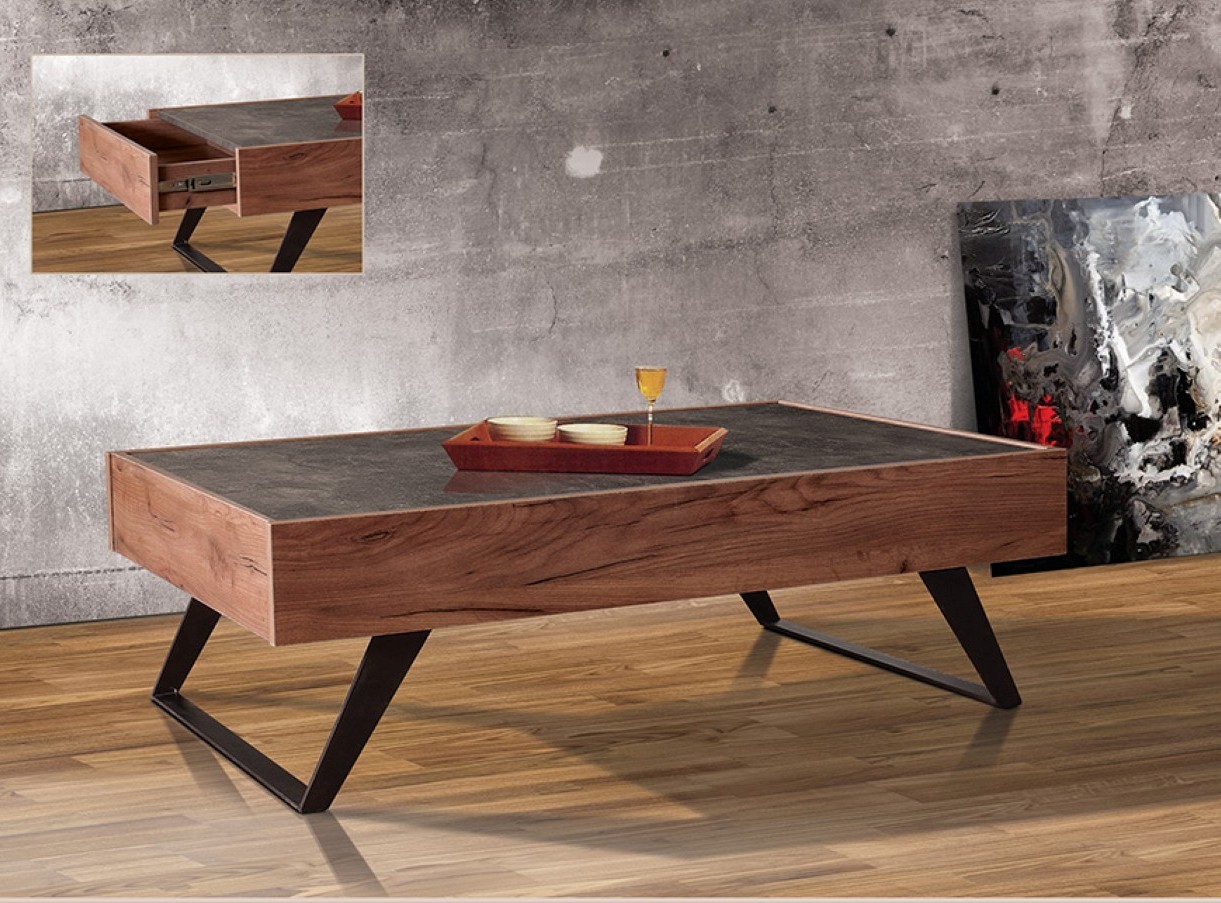 Τραπεζάκι σαλονιού industrial σχεδιασμού, που συνδυάζει τη φυσική ξύλινη βάση με μοντέρνα επιφάνεια και μεταλλικά πόδια σε γεωμετρική διάταξη. Διαθέτει συρτάρι για πρακτική αποθήκευση, προσφέροντας λειτουργικότητα χωρίς να αλλοιώνει την καθαρή αισθητική του σχεδίου. Ιδανικό για σύγχρονους χώρους με industrial ή urban χαρακτήρα.