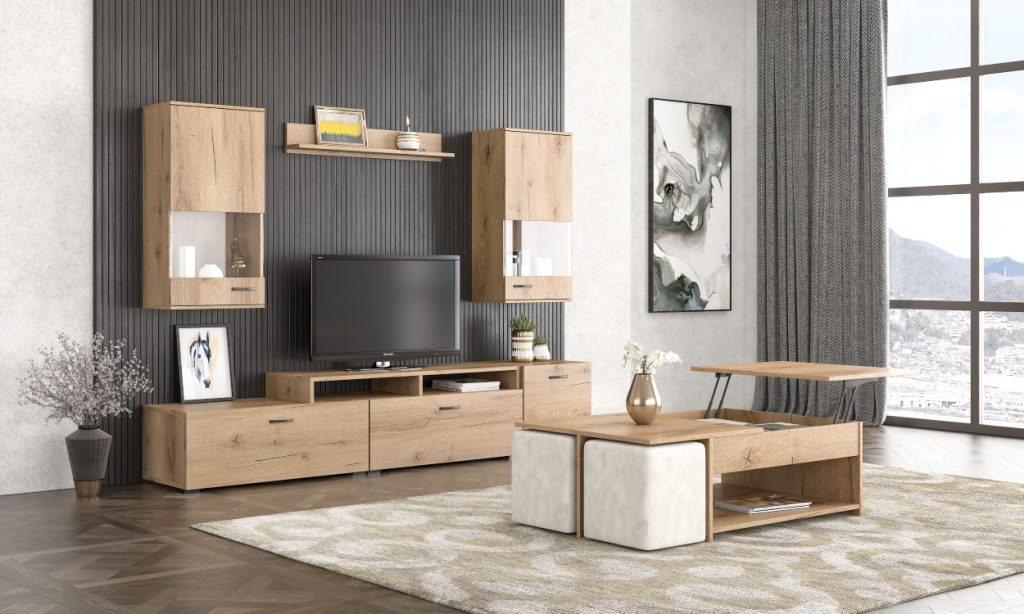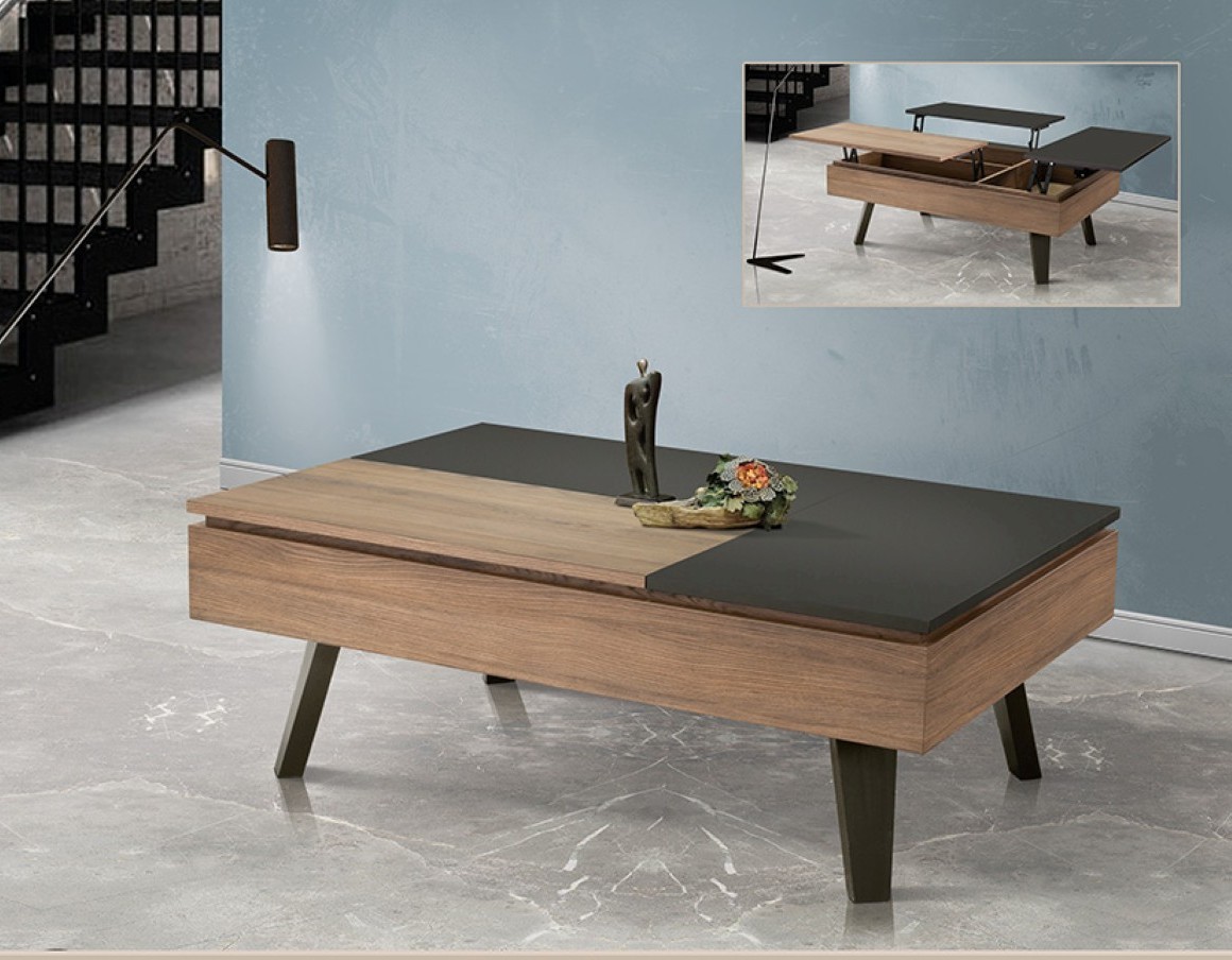 Τραπεζάκι σαλονιού μοντέρνου σχεδιασμού με ανυψούμενη επιφάνεια, που συνδυάζει φυσική ξύλινη υφή με σκουρόχρωμη επιφάνεια για κομψή αντίθεση. Διαθέτει μηχανισμό ανύψωσης που αποκαλύπτει κρυφό αποθηκευτικό χώρο, ιδανικό για καθημερινή χρήση και άψογη οργάνωση. Τα λοξά πόδια ενισχύουν τη σταθερότητα και προσδίδουν σύγχρονο χαρακτήρα.