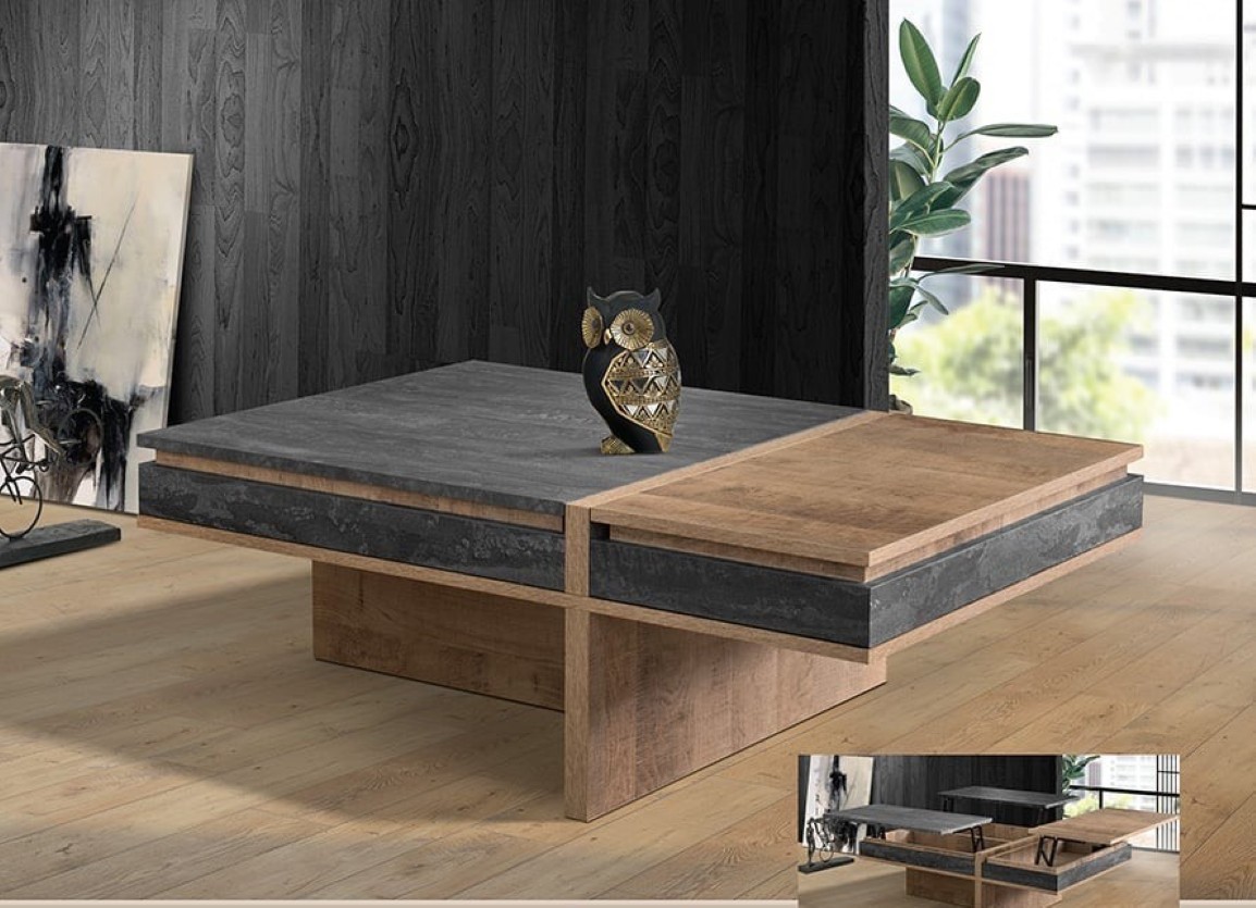 Τραπεζάκι σαλονιού μοντέρνου σχεδιασμού, με φυσική ξύλινη όψη και εφέ τσιμέντου που προσδίδει μοντέρνες νότες στον χώρο. Διαθέτει τρείς μηχανισμούς σερβιτόρου με κλειστούς αποθηκευτικούς χώρους, ιδανικούς για οργάνωση και πρακτική καθημερινή χρήση. Ο στιβαρός σχεδιασμός το καθιστά ιδανικό για σύγχρονα και minimal σαλόνια.