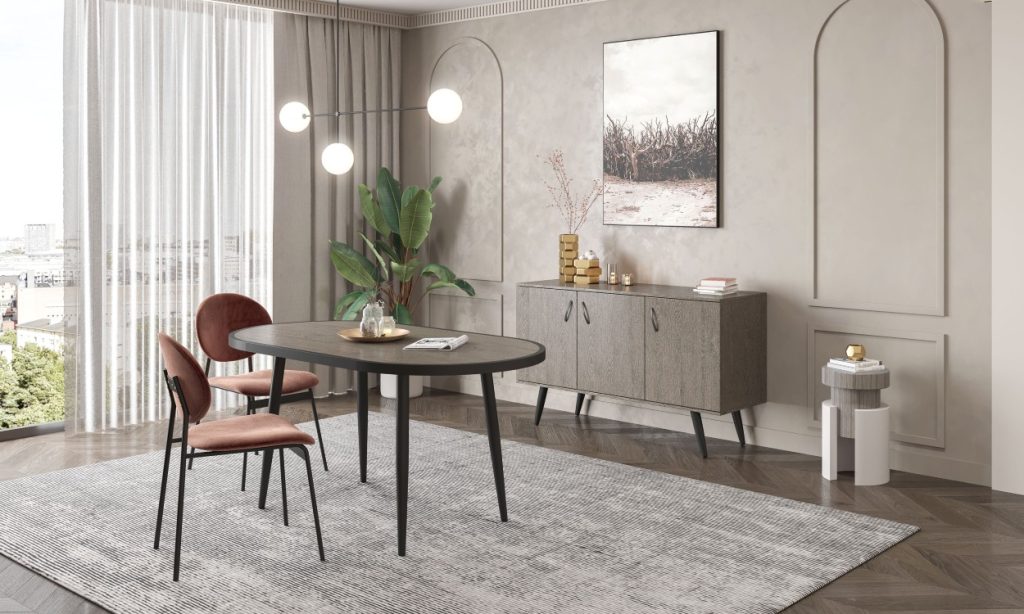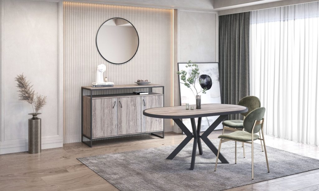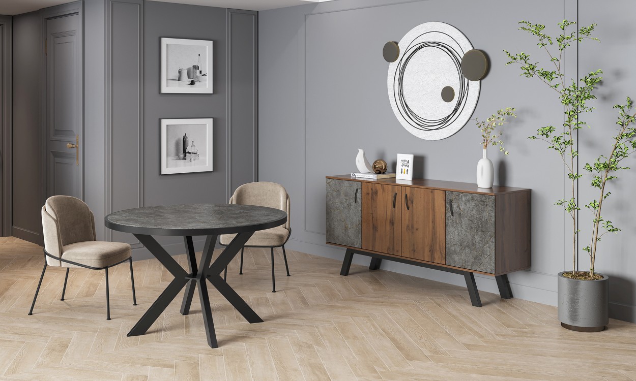 Κομψό τραπέζι τραπεζαρίας με μοντέρνο, στρογγυλό σχεδιασμό που προσφέρει άνετη διάταξη καθισμάτων. Στιβαρή κατασκευή και καλαίσθητη βάση που χαρίζουν σταθερότητα και στυλ. Ιδανική επιλογή για σύγχρονους και ζεστούς χώρους τραπεζαρίας.